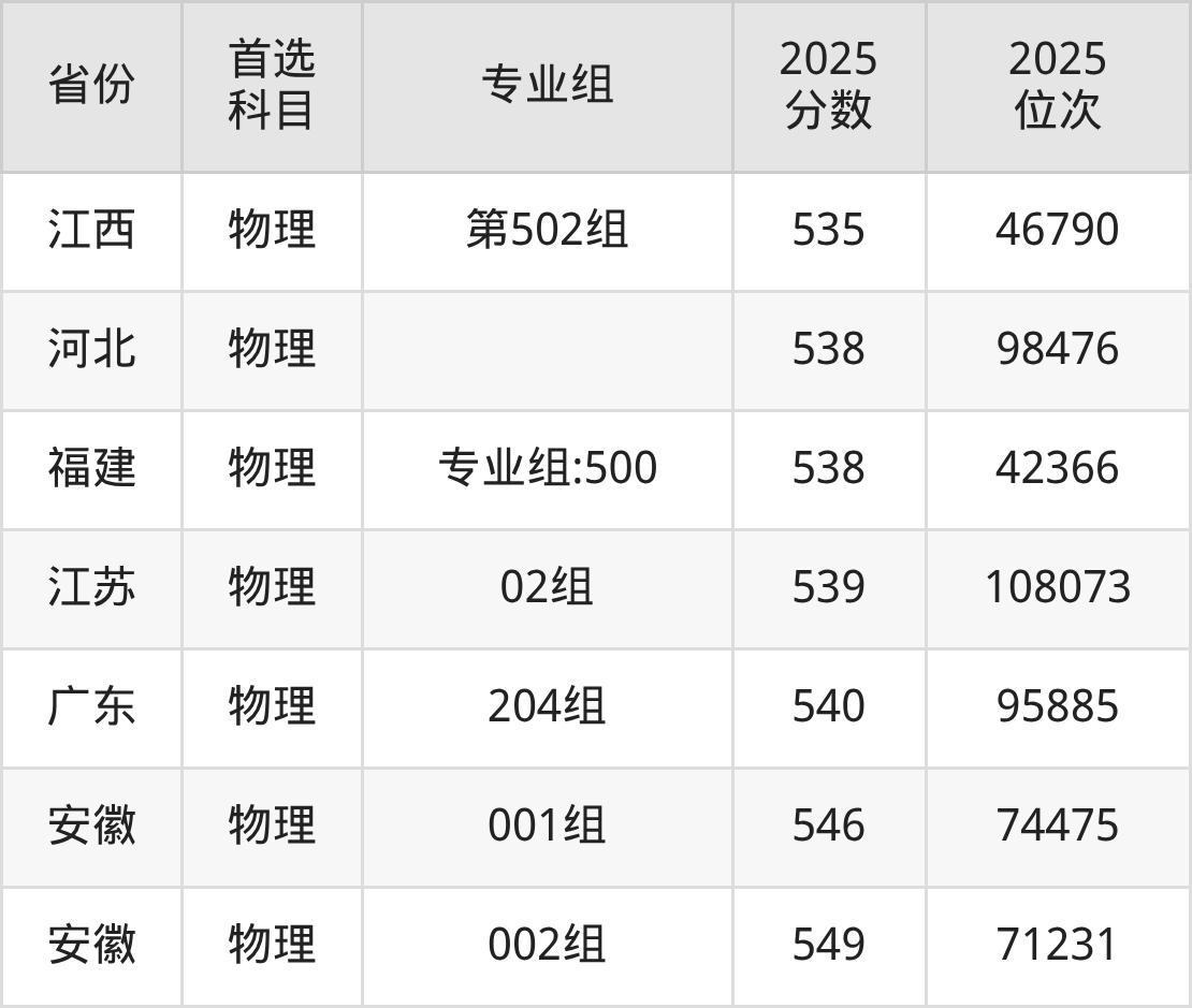 物理类最低分对应地区为贵州,录取位次为80269;最高分对应地区为安徽(002组),录取位次为71231,超本科线88分。