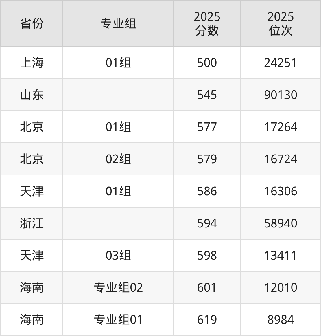 最低分对应地区为上海(01组),录取位次为24251,超本科线98分;最高分对应地区为海南(专业组01),录取位次为8984,超本科线139分。
