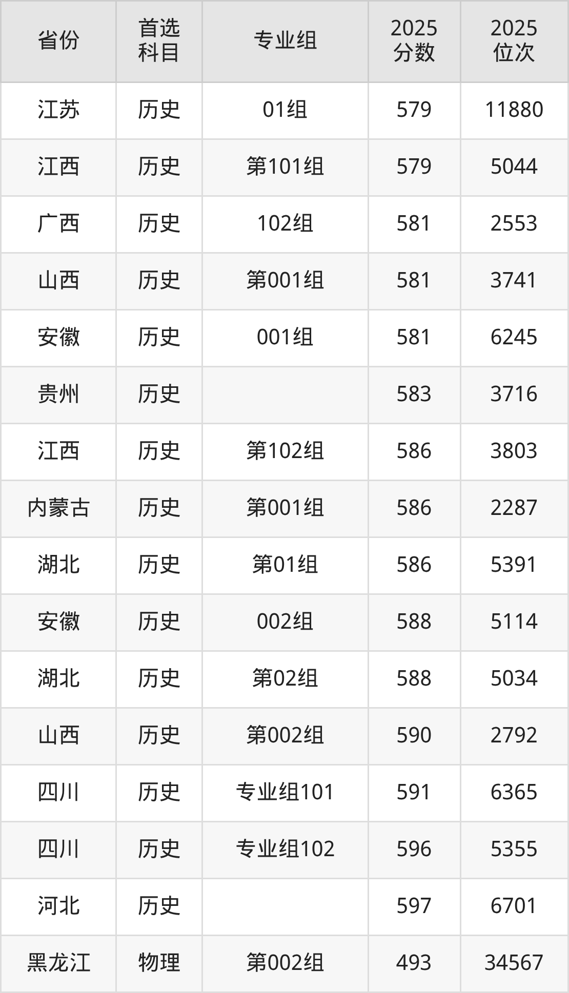 历史类:第102组562分、6962名,第103组571分、5446名,第104组573分、5153名,第305组(国家专项)563分、6763名,第406组(地方专项)565分、6402名,第407组(地方专项)568分、5877名;