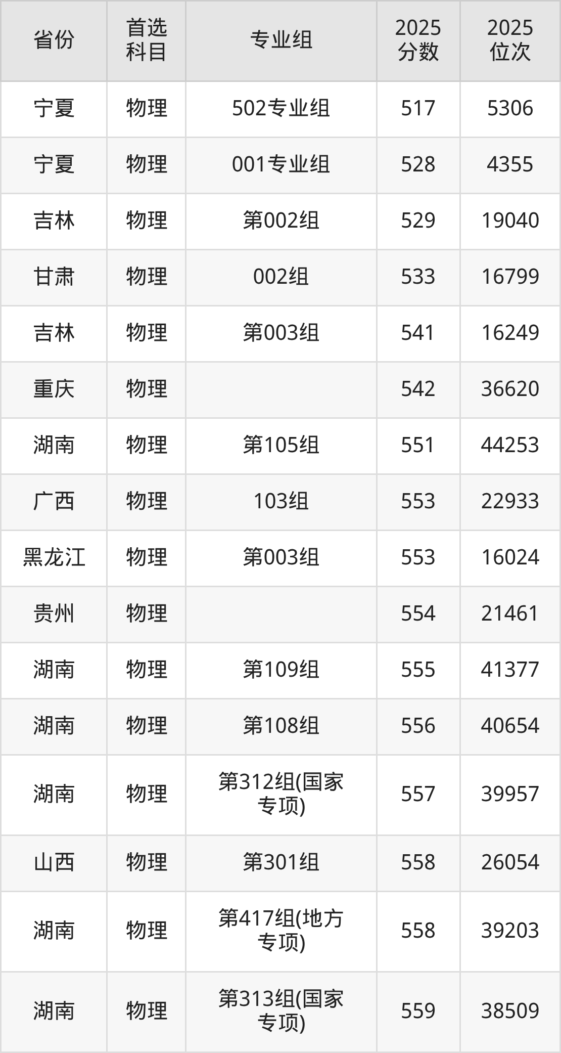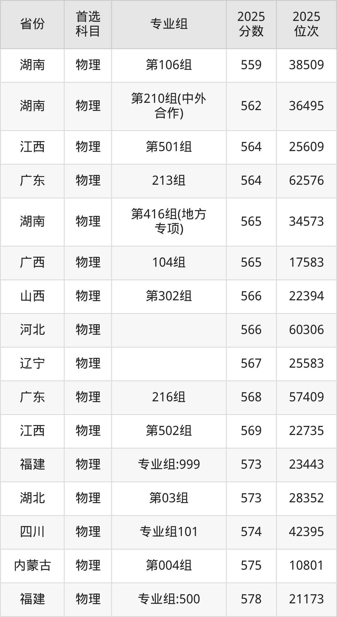 物理类:第106组557分、37028名,第107组572分、28195名,第108组587分、20665名,第109组564分、32787名,第111组558分、36422名,第210组(中外合作)554分、38902名,第314组(国家专项)564分、32787名,第315组(国家专项)555分、38276名,第418组(地方专项)566分、31612名,第419组(地方专项)556分、37666名,第612组(定向西藏就业)553分、39598名。