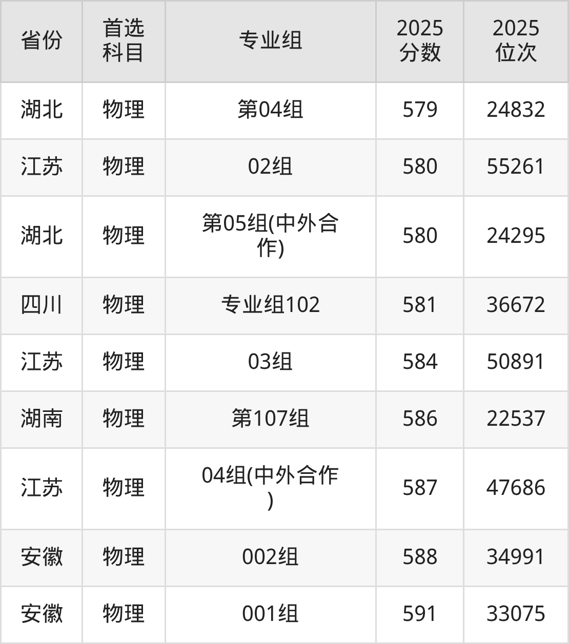 物理类:第108组555分、37811名,第109组567分、30156名,第110组584分、21009名,第111组551分、40582名,第112组554分、38493名,第213组(中外合作)555分、37811名,第314组(国家专项)562分、33236名,第315组(国家专项)559分、35155名,第416组(地方专项)562分、33236名,第417组(地方专项)555分、37811名;