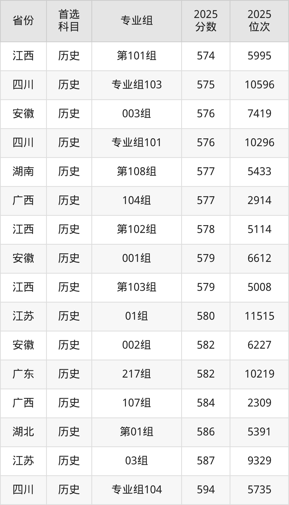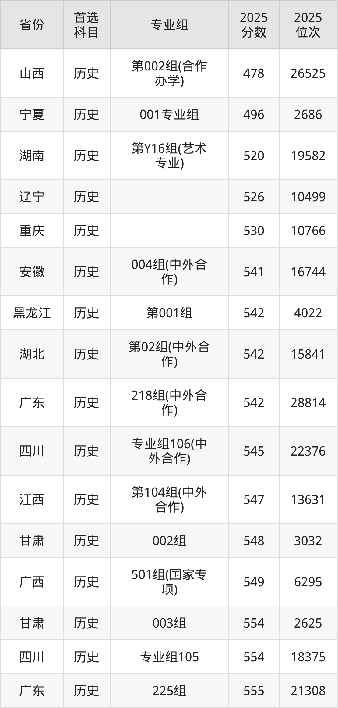 历史类最低分对应地区为山西(第002组(合作办学)),录取位次为26525,超本科线35分;最高分对应地区为四川(专业组102),录取位次为4584,超本科B133分。