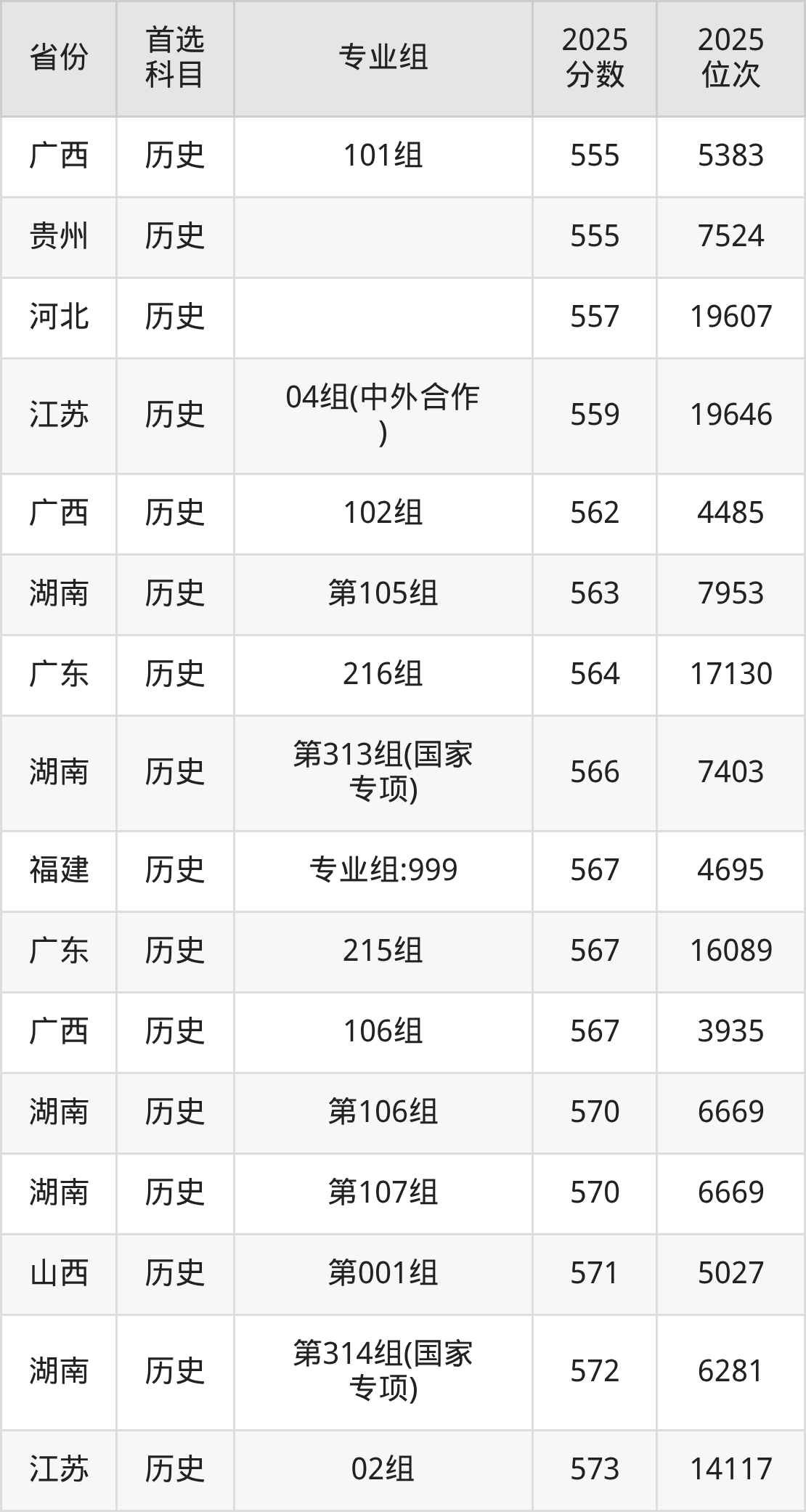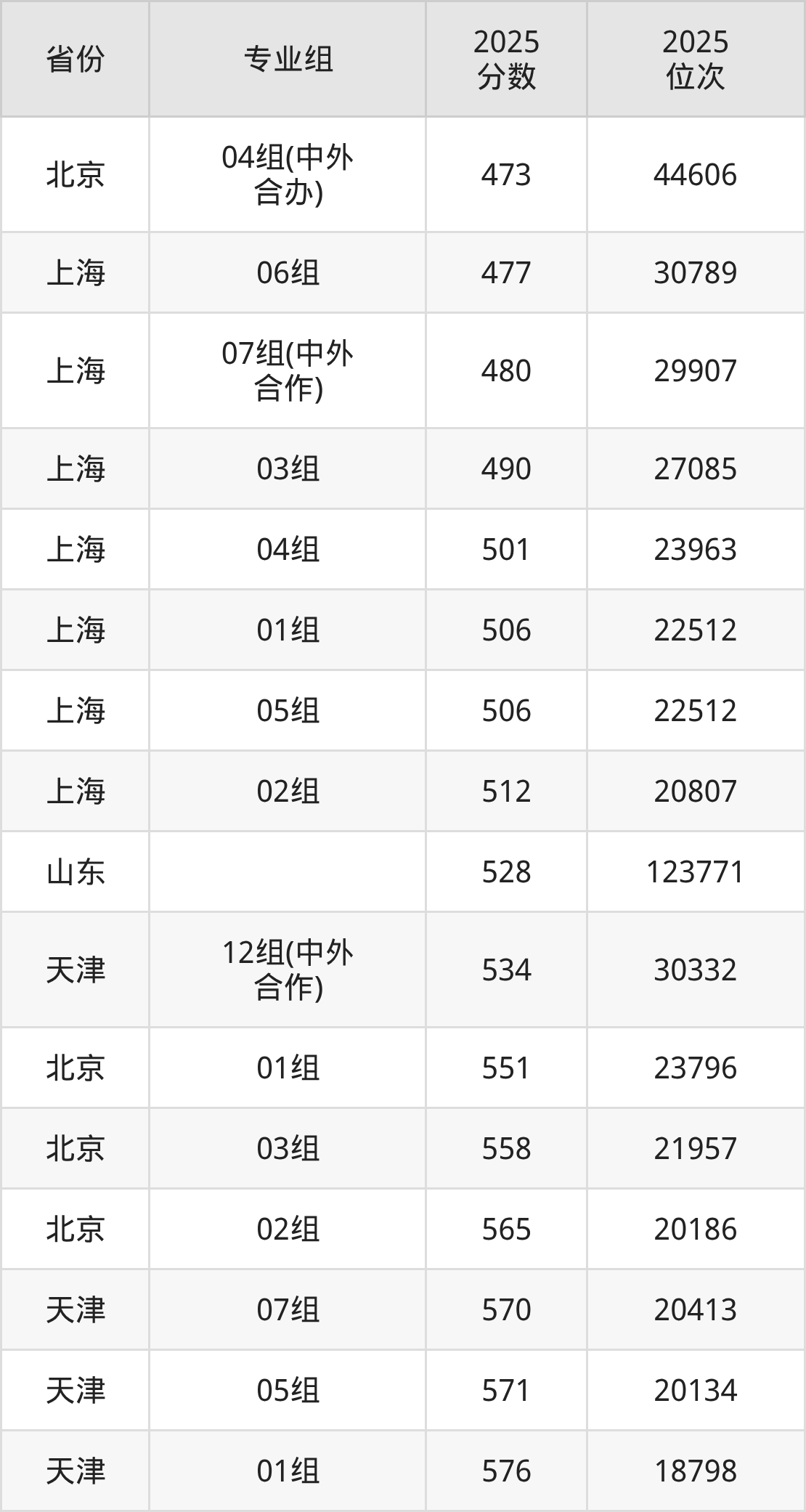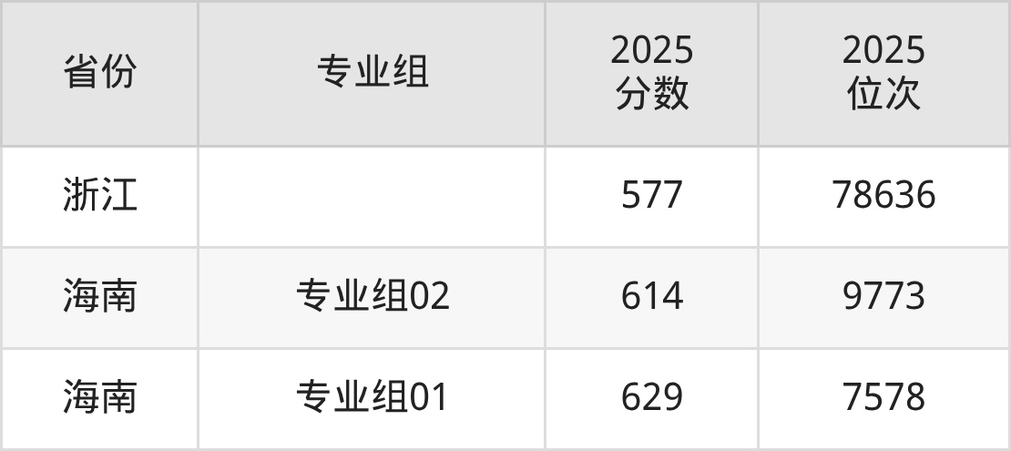 最低分对应地区为北京(04组(中外合办)),录取位次为44606,超本科线43分;最高分对应地区为海南(专业组01),录取位次为7578,超本科线149分。