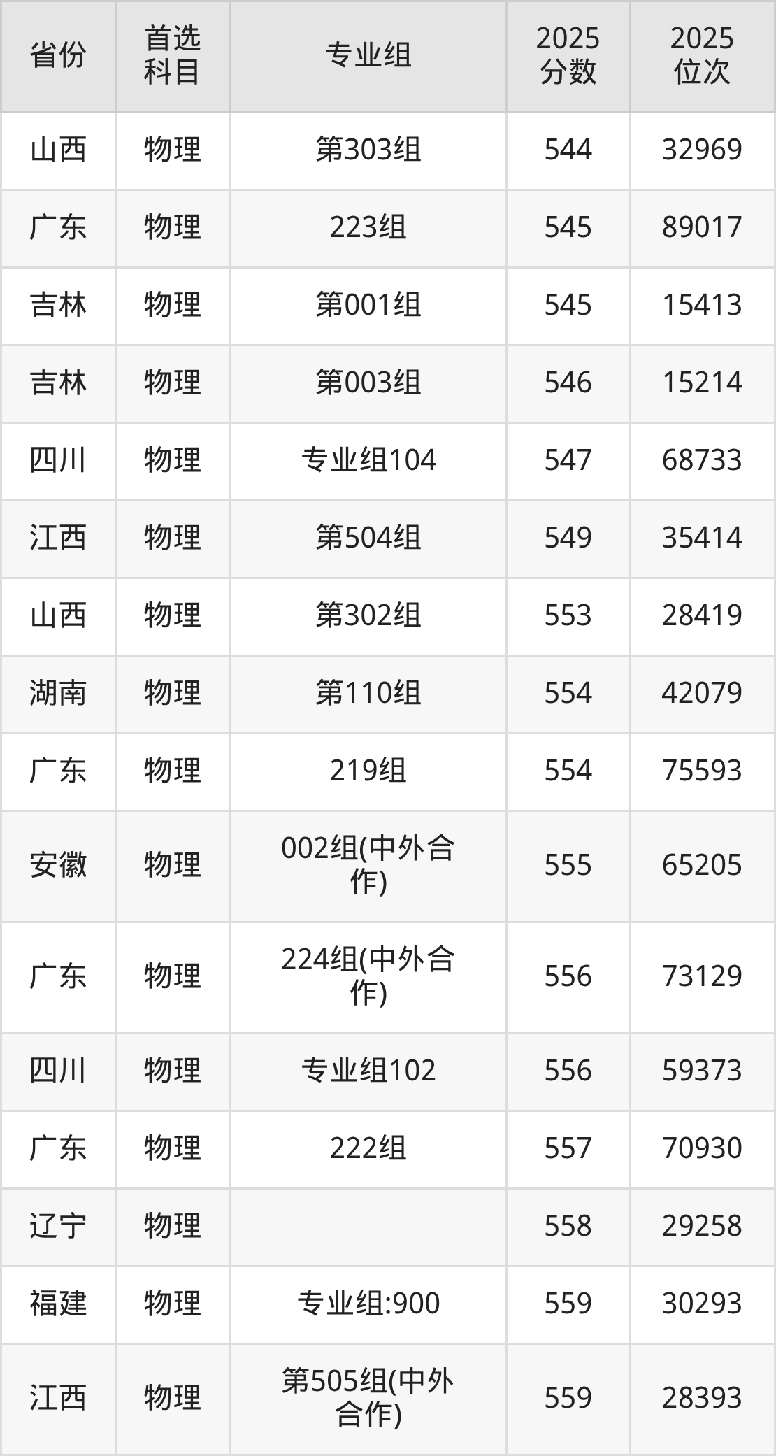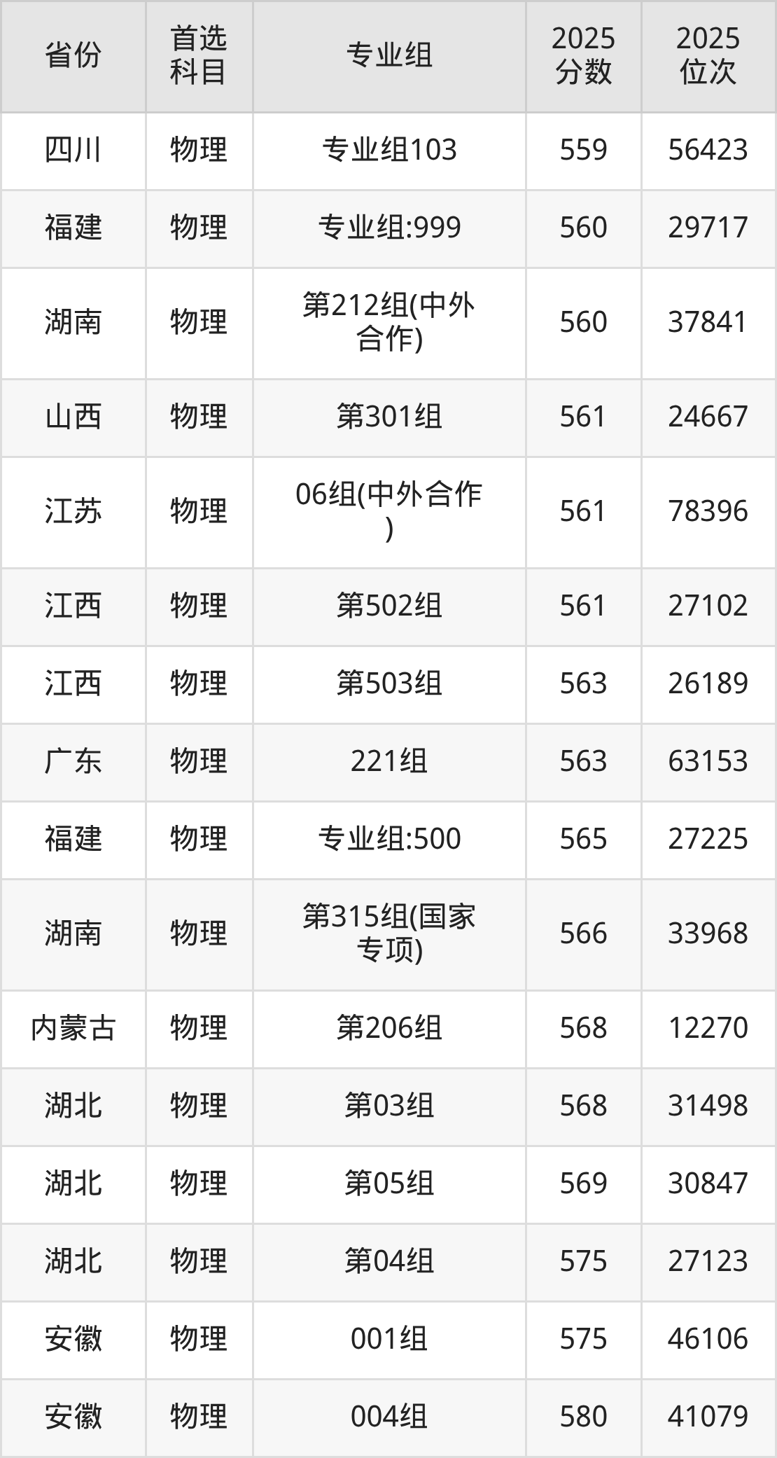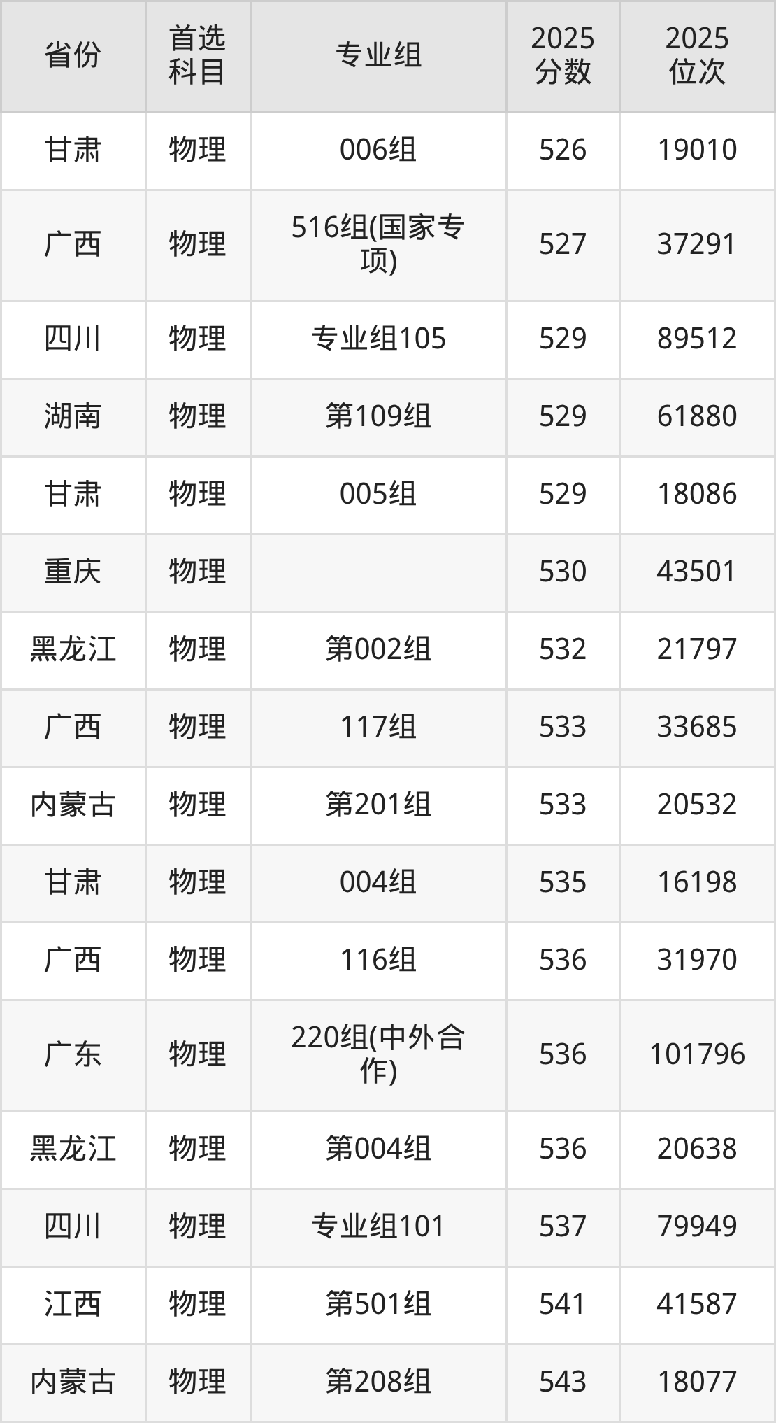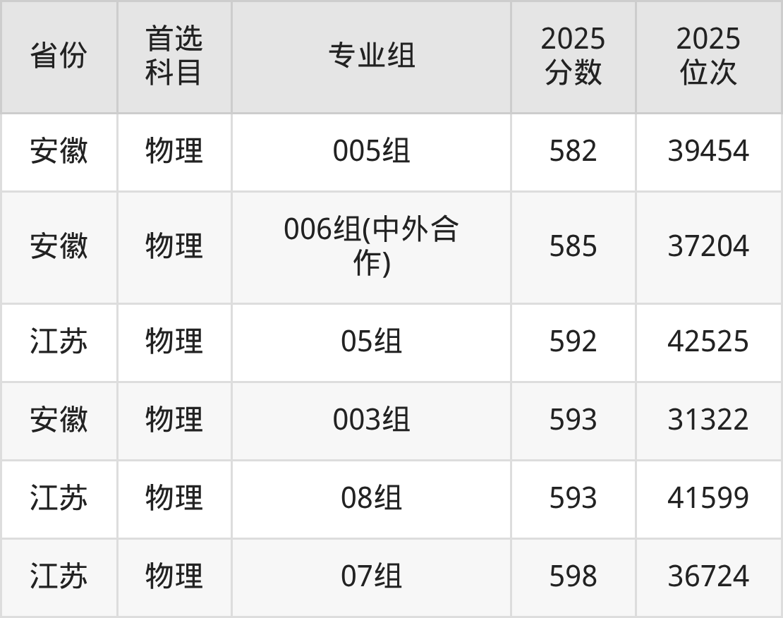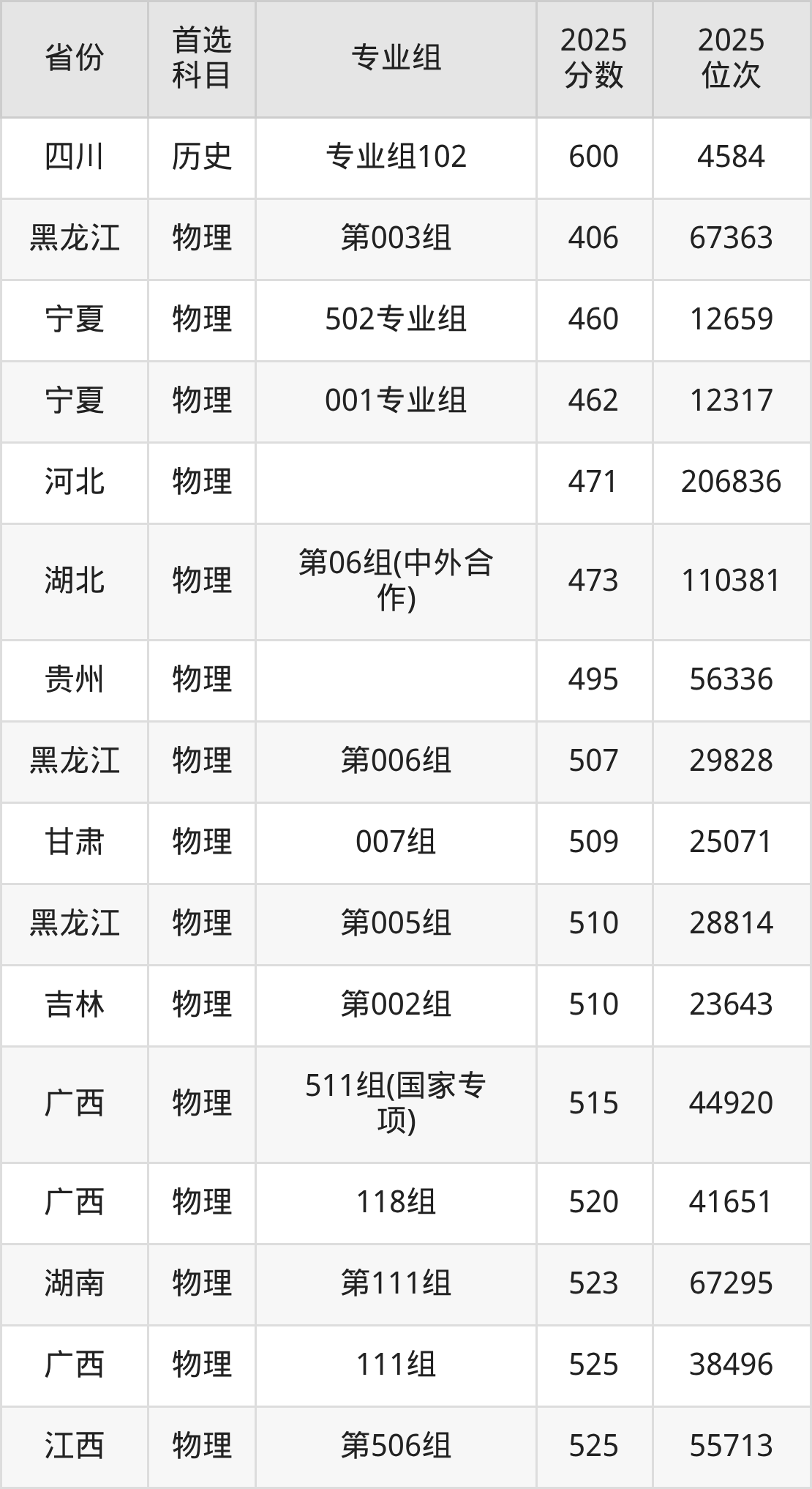 物理类最低分对应地区为黑龙江(第003组),录取位次为67363,超本科线46分;最高分对应地区为江苏(07组),录取位次为36724,超本科线135分。