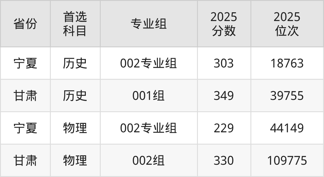 物理类最低分对应地区为宁夏(002专业组),录取位次为44149,超专科线79分;最高分对应地区为甘肃(002组),录取位次为109775。