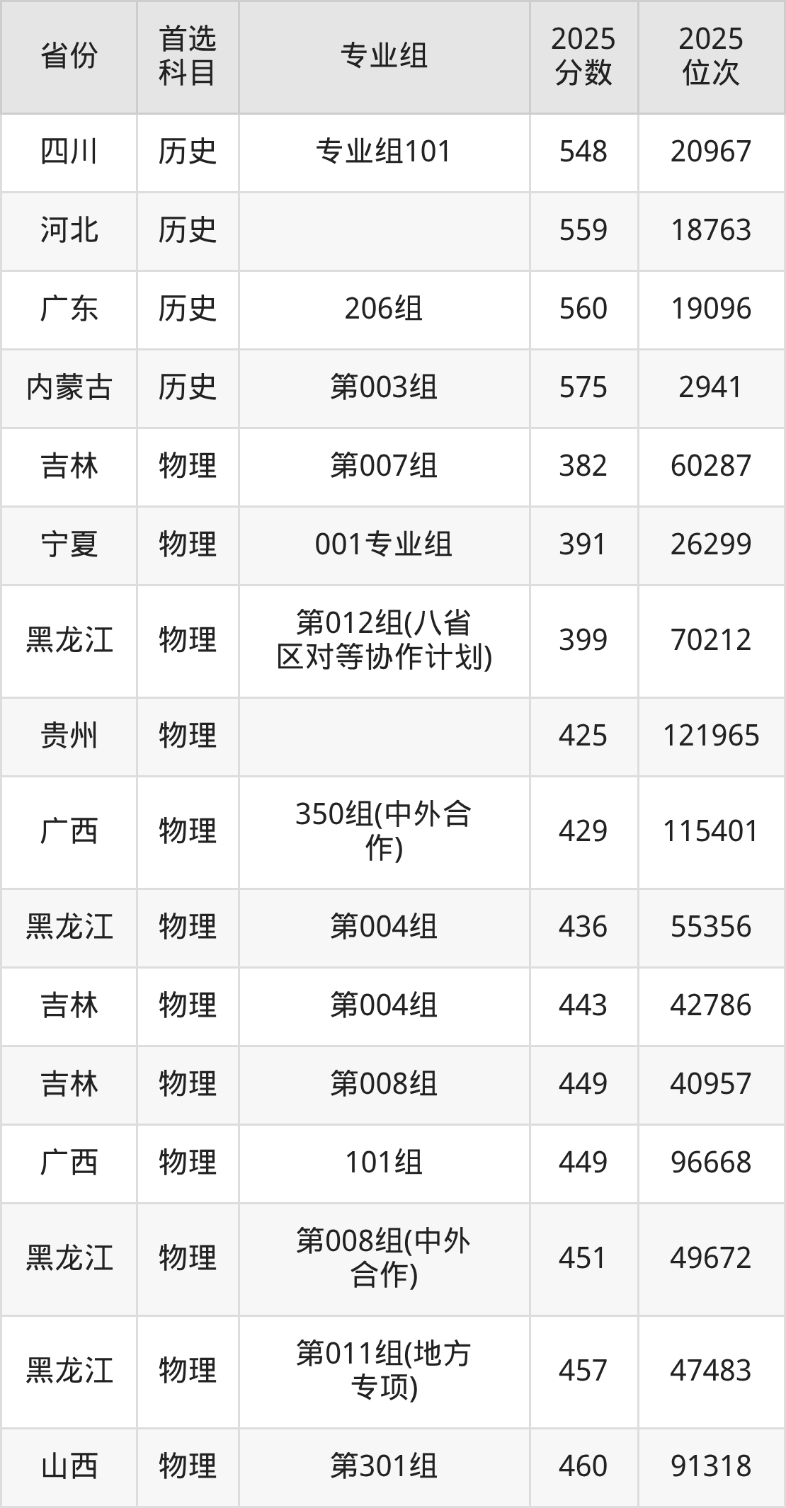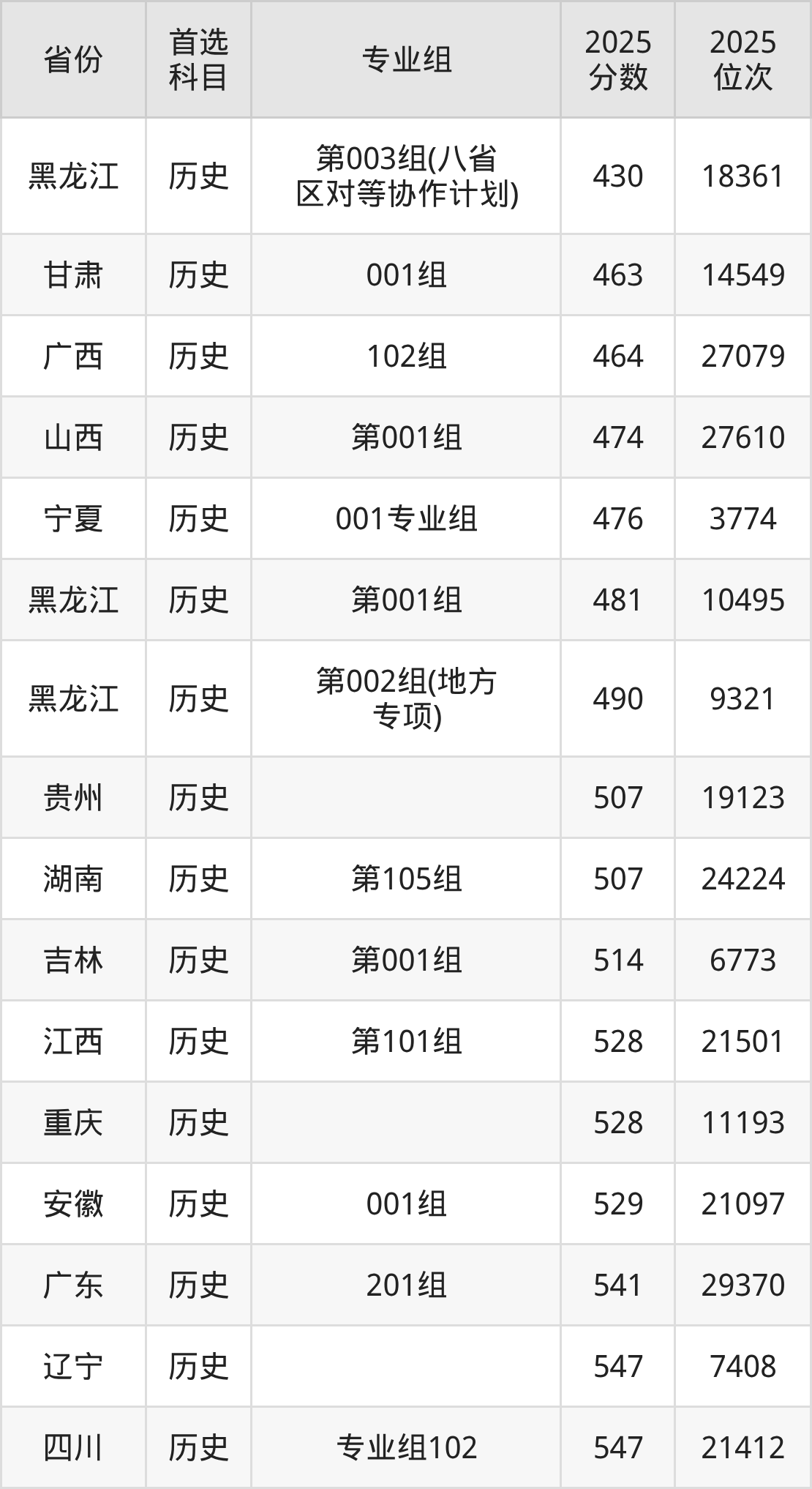 历史类最低分对应地区为黑龙江(第003组(八省区对等协作计划)),录取位次为18361,超本科线25分;最高分对应地区为内蒙古(第003组),录取位次为2941,超本科线157分。