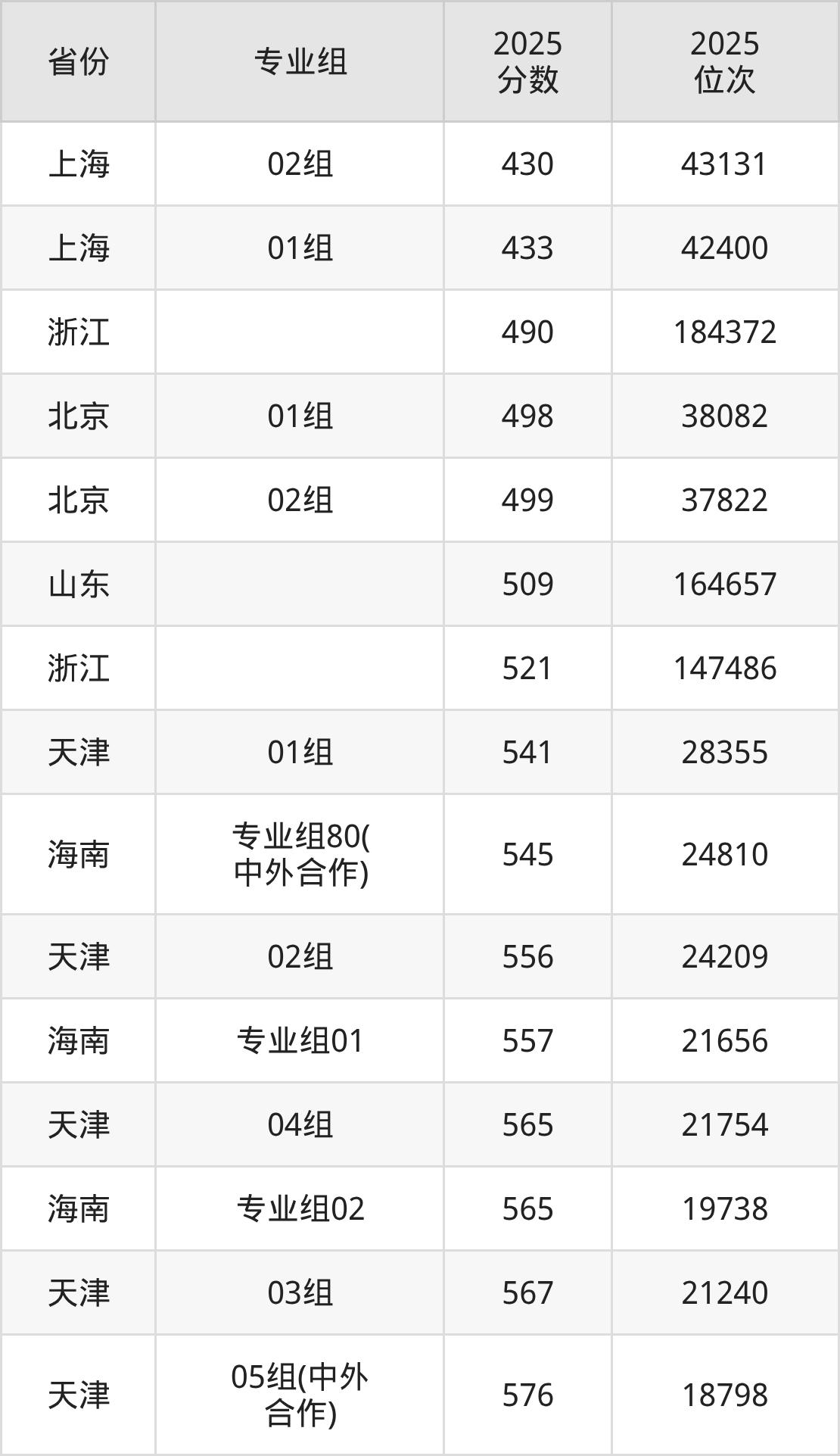 最低分对应地区为上海(02组),录取位次为43131,超本科线28分;最高分对应地区为天津(05组(中外合作)),录取位次为18798。