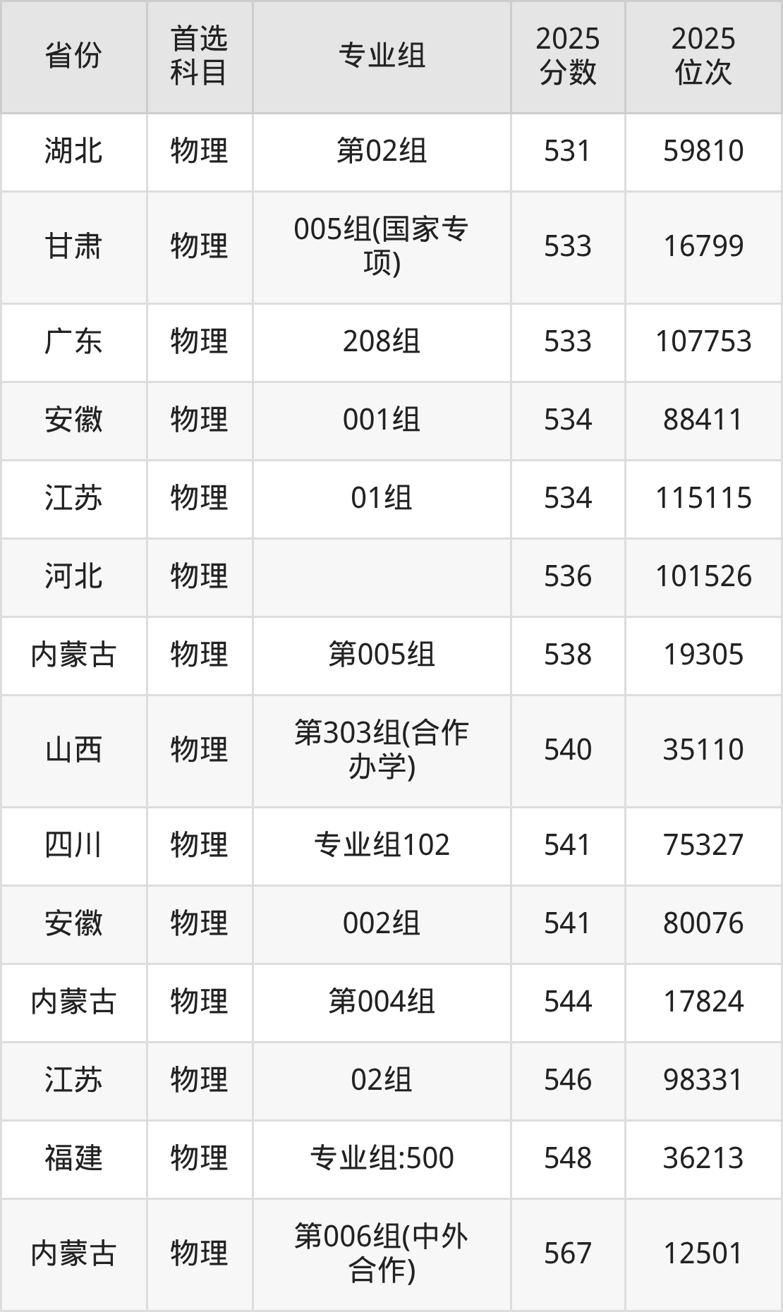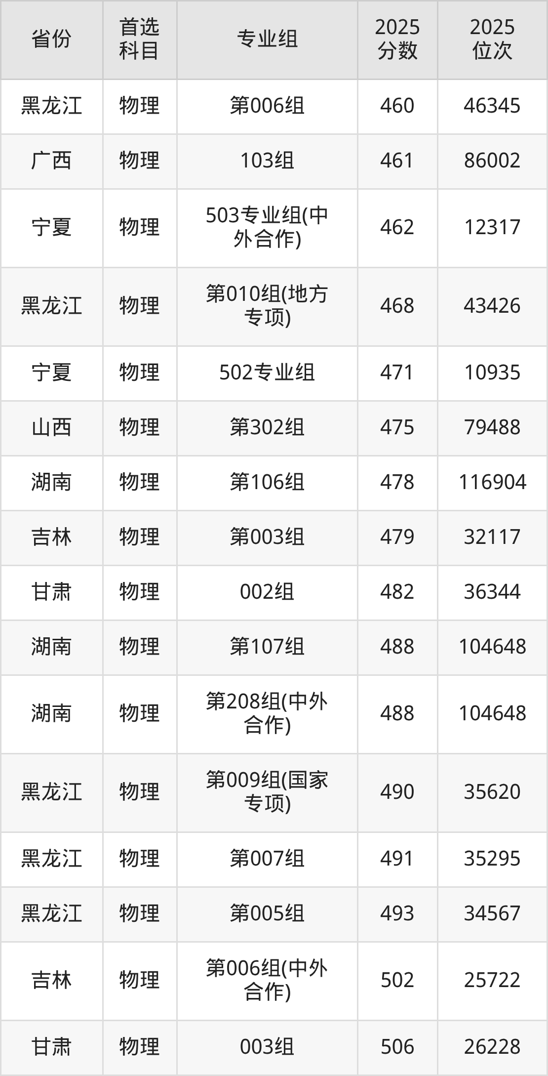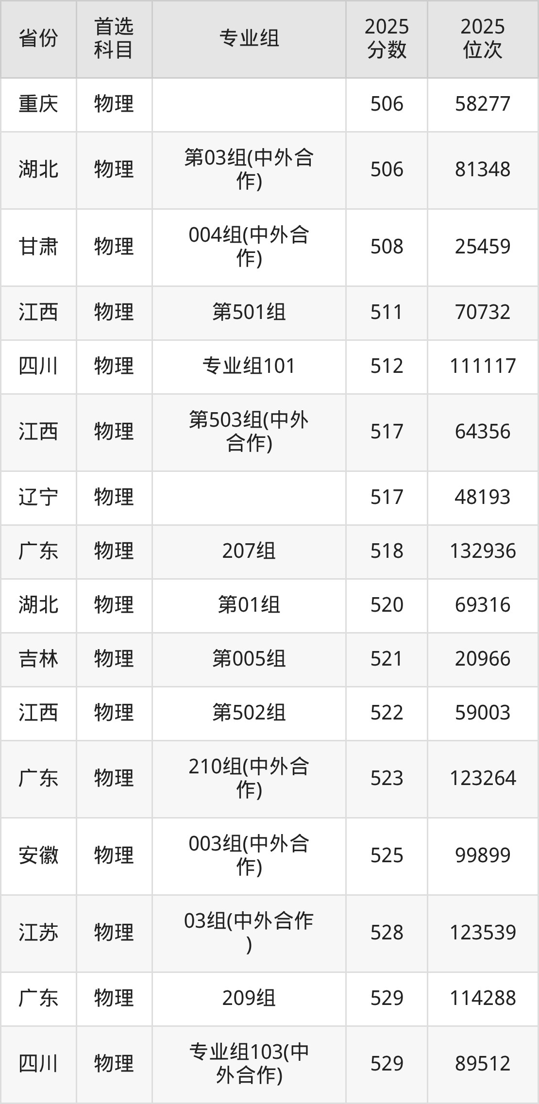 物理类最低分对应地区为吉林(第007组),录取位次为60287,超本科线42分;最高分对应地区为内蒙古(第006组(中外合作)),录取位次为12501,超本科线192分。