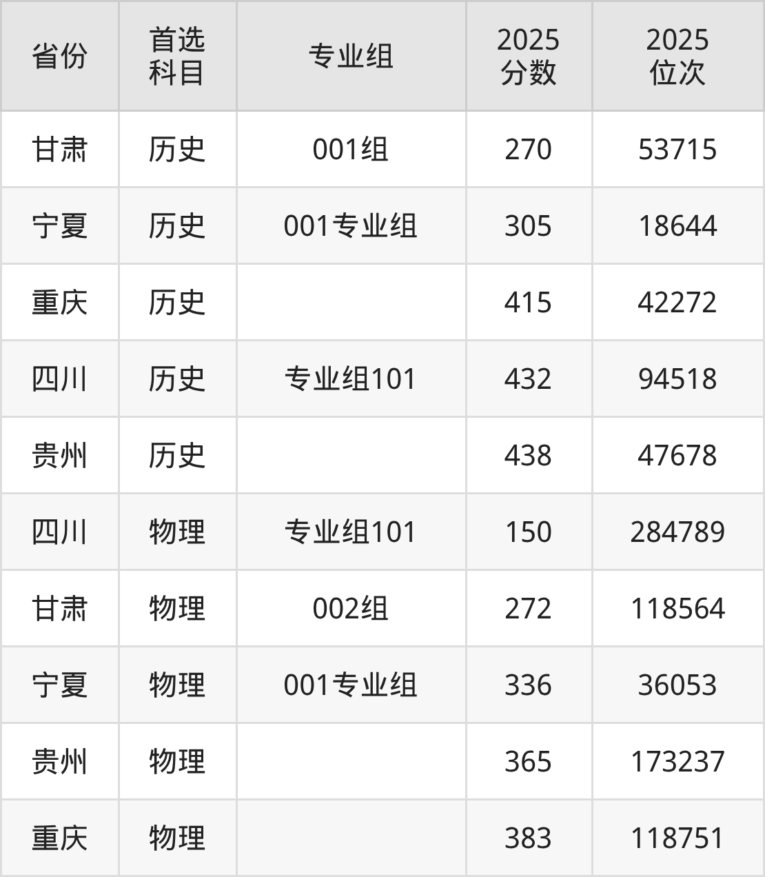 物理类最低分对应地区为四川(专业组101),录取位次为284789;最高分对应地区为重庆,录取位次为118751,超专科线203分。