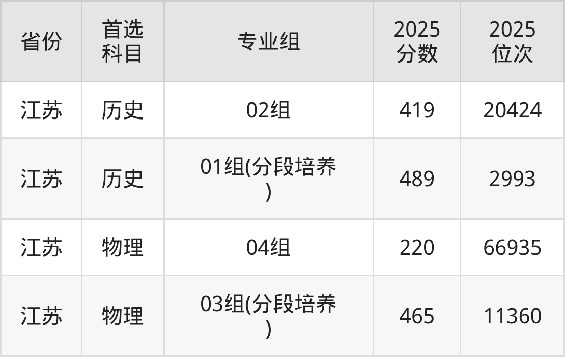 历史类最低分对应地区为江苏(02组),录取位次为20424,超专科线199分;最高分对应地区为江苏(01组(分段培养)),录取位次为2993,超专科线269分。