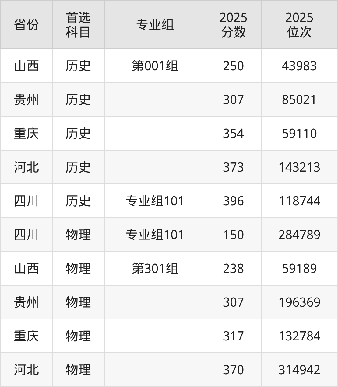 历史类最低分对应地区为山西(第001组),录取位次为43983;最高分对应地区为四川(专业组101),录取位次为118744,超专科线246分。