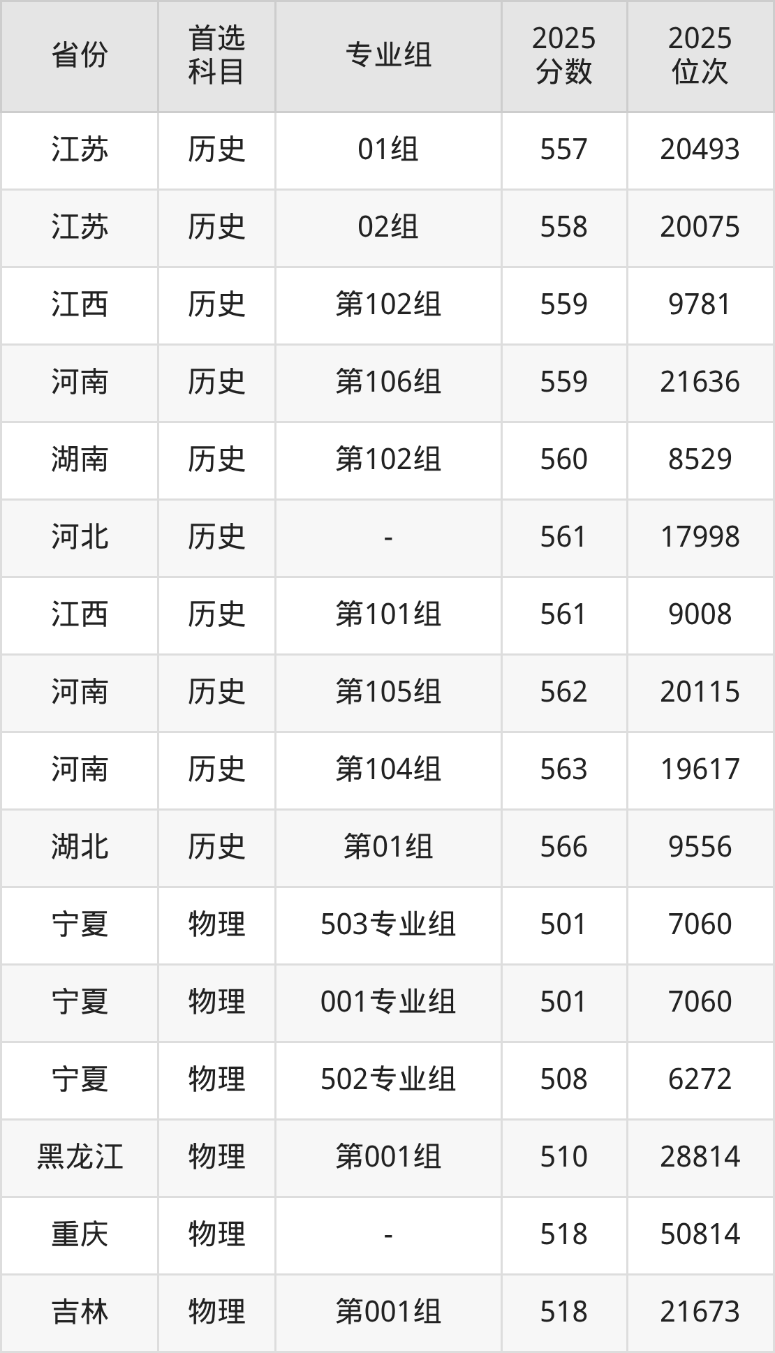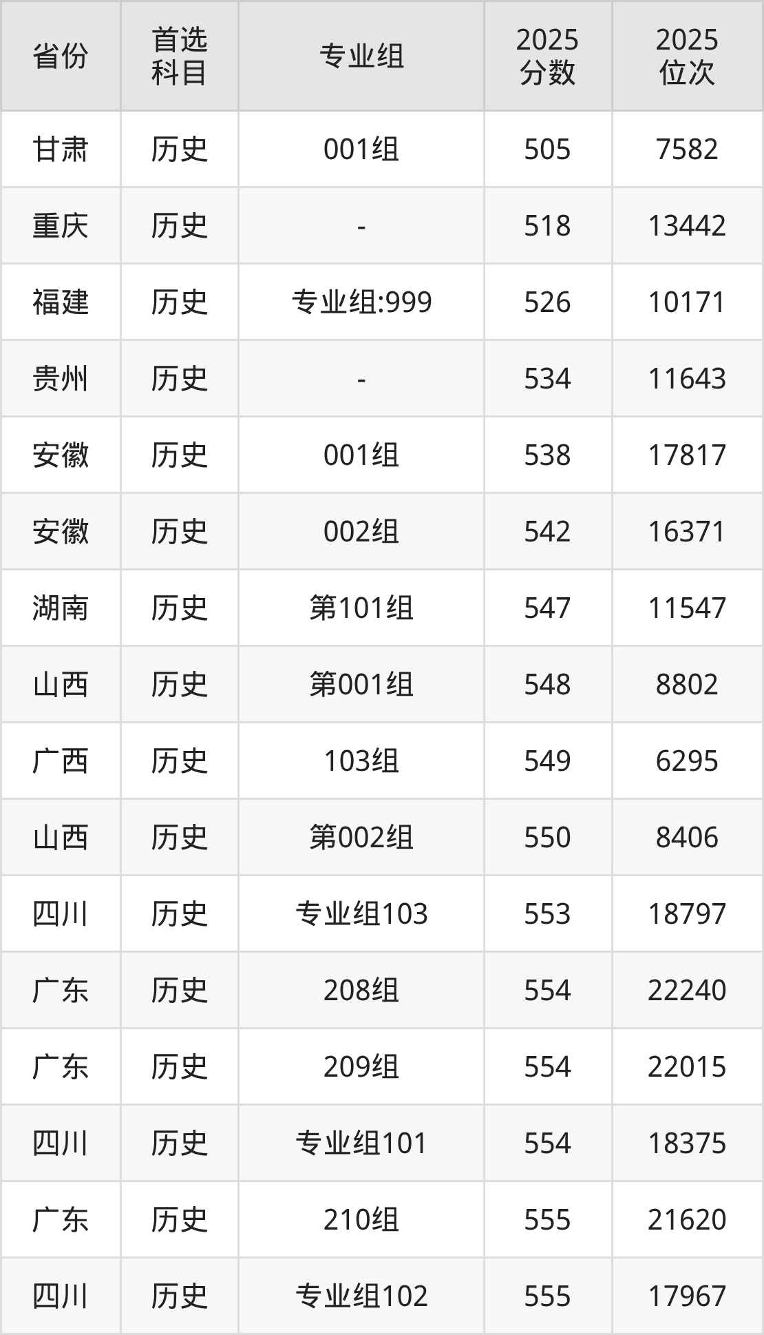 历史类最低分对应地区为甘肃(001组),录取位次为7582,超本科线93分;最高分对应地区为湖北(第01组),录取位次为9556,超本科线124分。