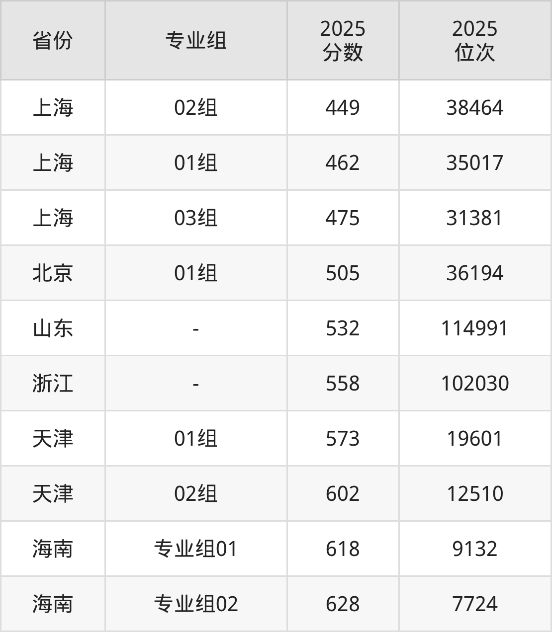 最低分对应地区为上海(02组),录取位次为38464,超本科线47分;最高分对应地区为海南(专业组02),录取位次为7724,超本科线148分。
