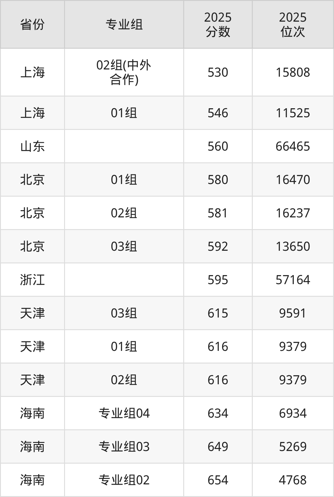 最低分对应地区为上海(02组(中外合作)),录取位次为15808,超本科线128分;最高分对应地区为海南(专业组02),录取位次为4768,超本科线174分。