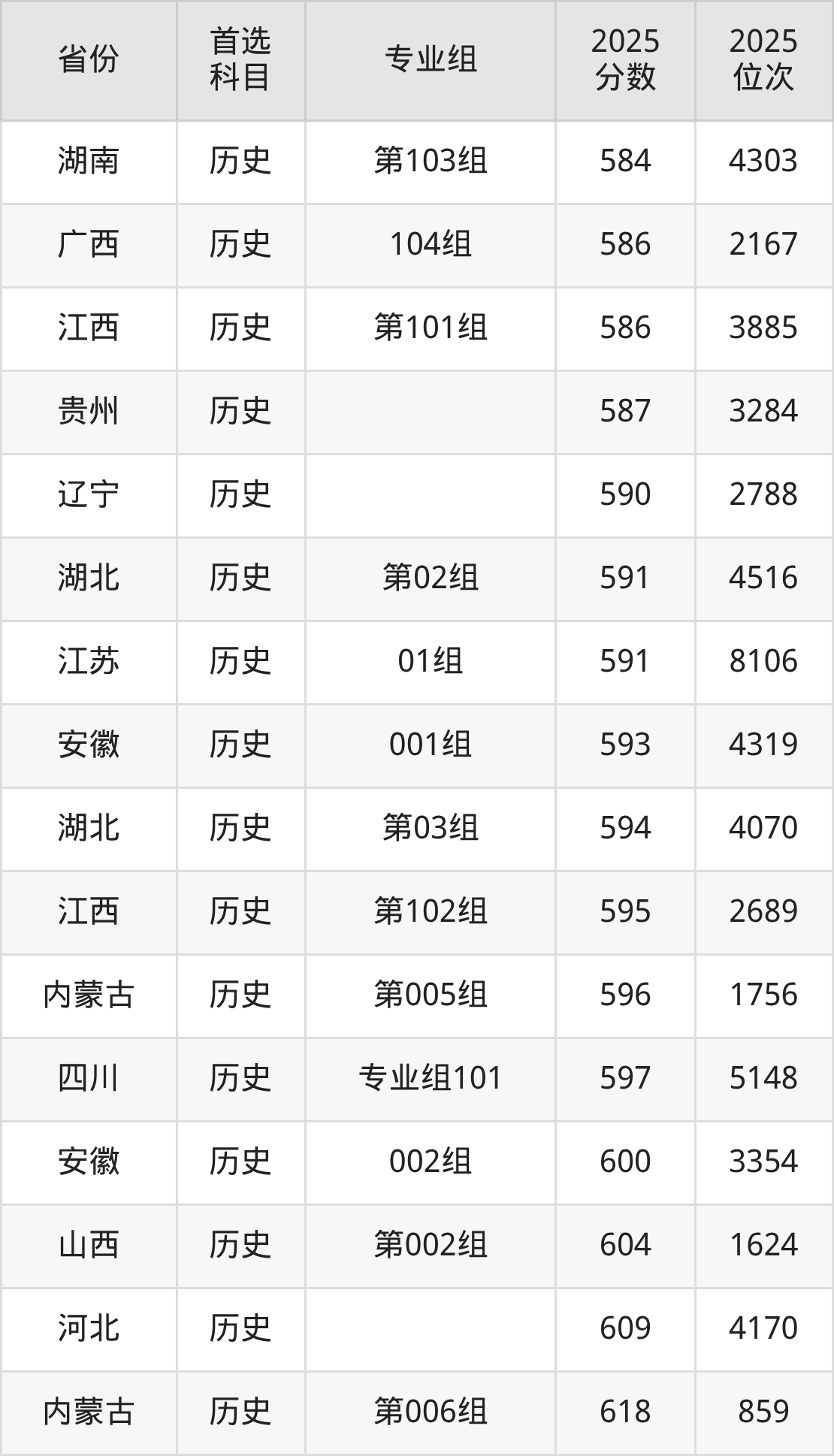 历史类最低分对应地区为宁夏(001专业组),录取位次为1181,超本科B133分;最高分对应地区为内蒙古(第006组),录取位次为859。