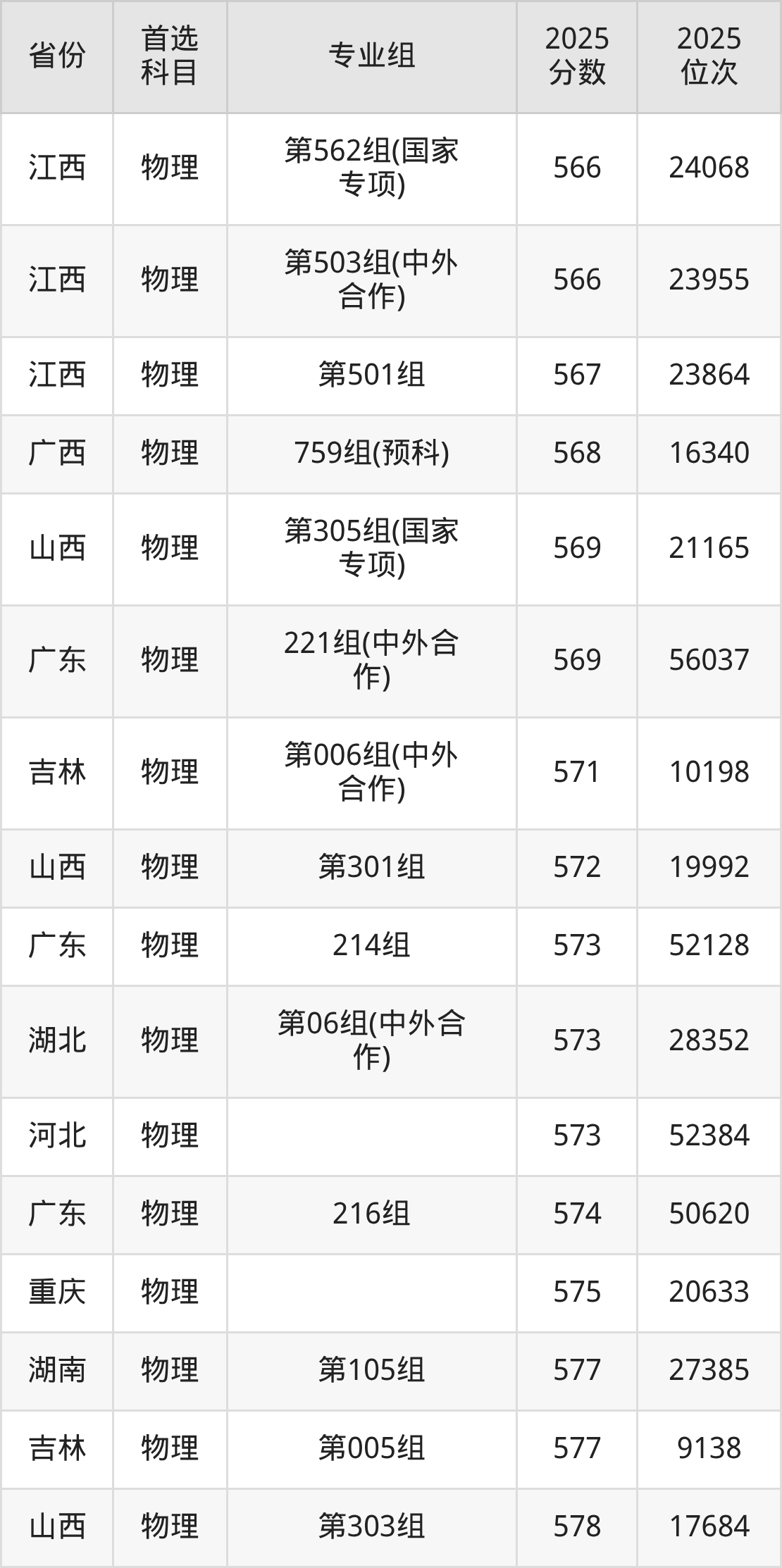 物理类:第501组573分、23458名,第502组591分、14537名,第503组(中外合作)576分、21657名,第504组585分、17182名,第561组(国家专项)576分、21608名;