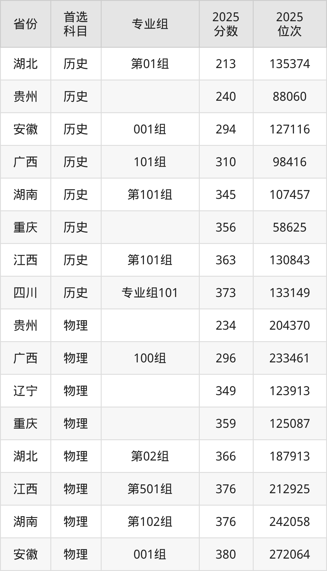 历史类最低分对应地区为湖北(第01组),录取位次为135374,超专科线13分;最高分对应地区为四川(专业组101),录取位次为133149,超专科线223分。