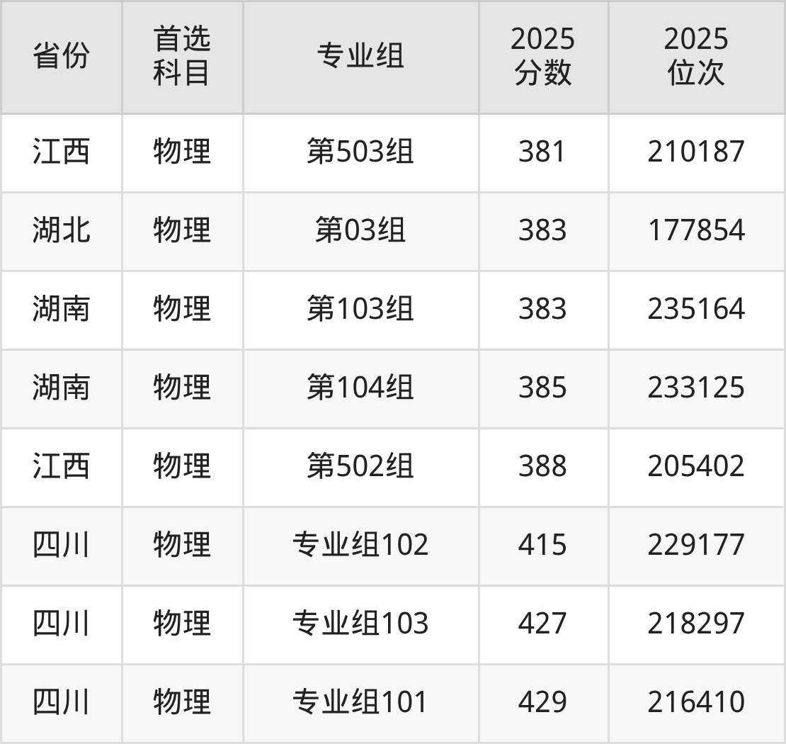 物理类最低分对应地区为贵州,录取位次为204370,超专科线54分;最高分对应地区为四川(专业组101),录取位次为216410,超专科线279分。