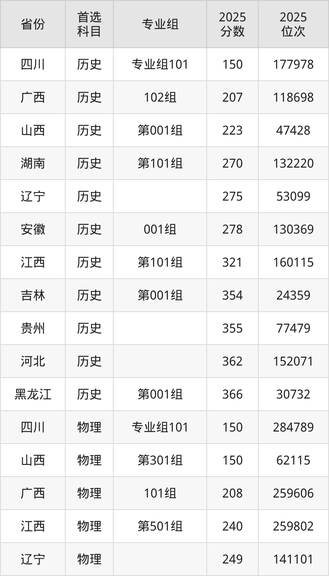 历史类最低分对应地区为四川(专业组101),录取位次为177978;最高分对应地区为黑龙江(第001组),录取位次为30732,超专科线206分。