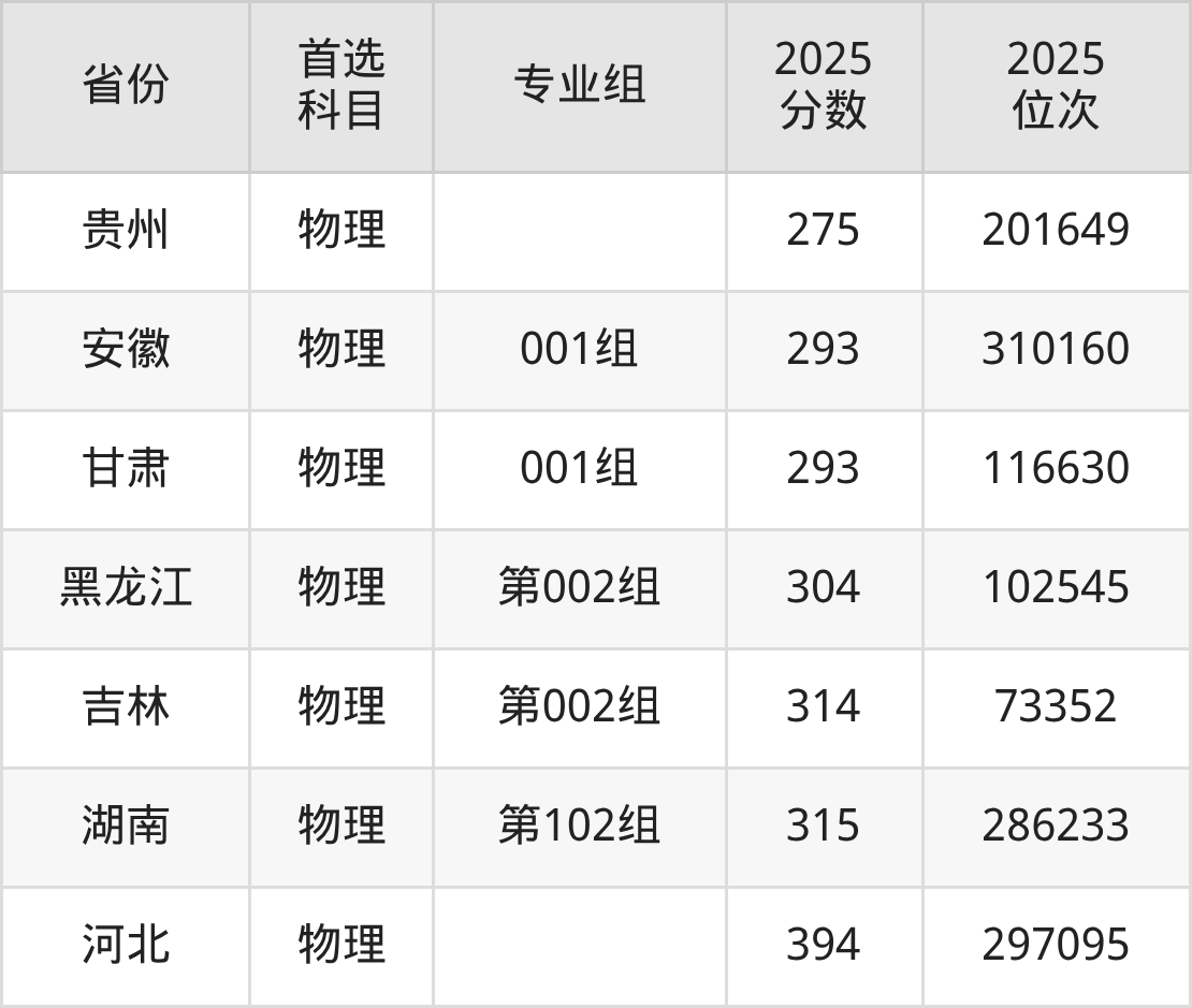 物理类最低分对应地区为四川(专业组101),录取位次为284789;最高分对应地区为河北,录取位次为297095,超专科线194分。