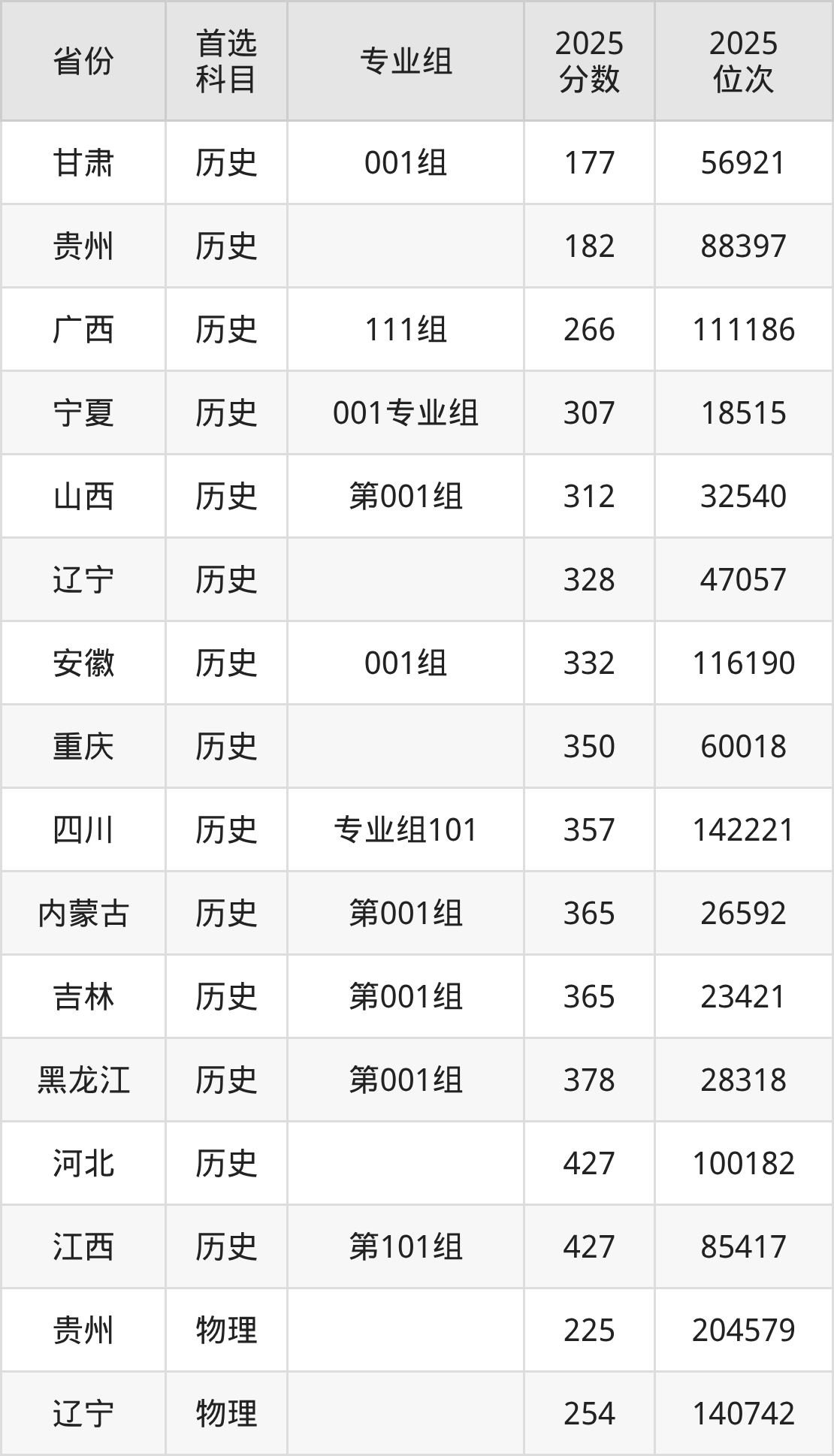 历史类最低分对应地区为甘肃(001组),录取位次为56921,超专科线17分;最高分对应地区为江西(第101组),录取位次为85417,超专科线137分。