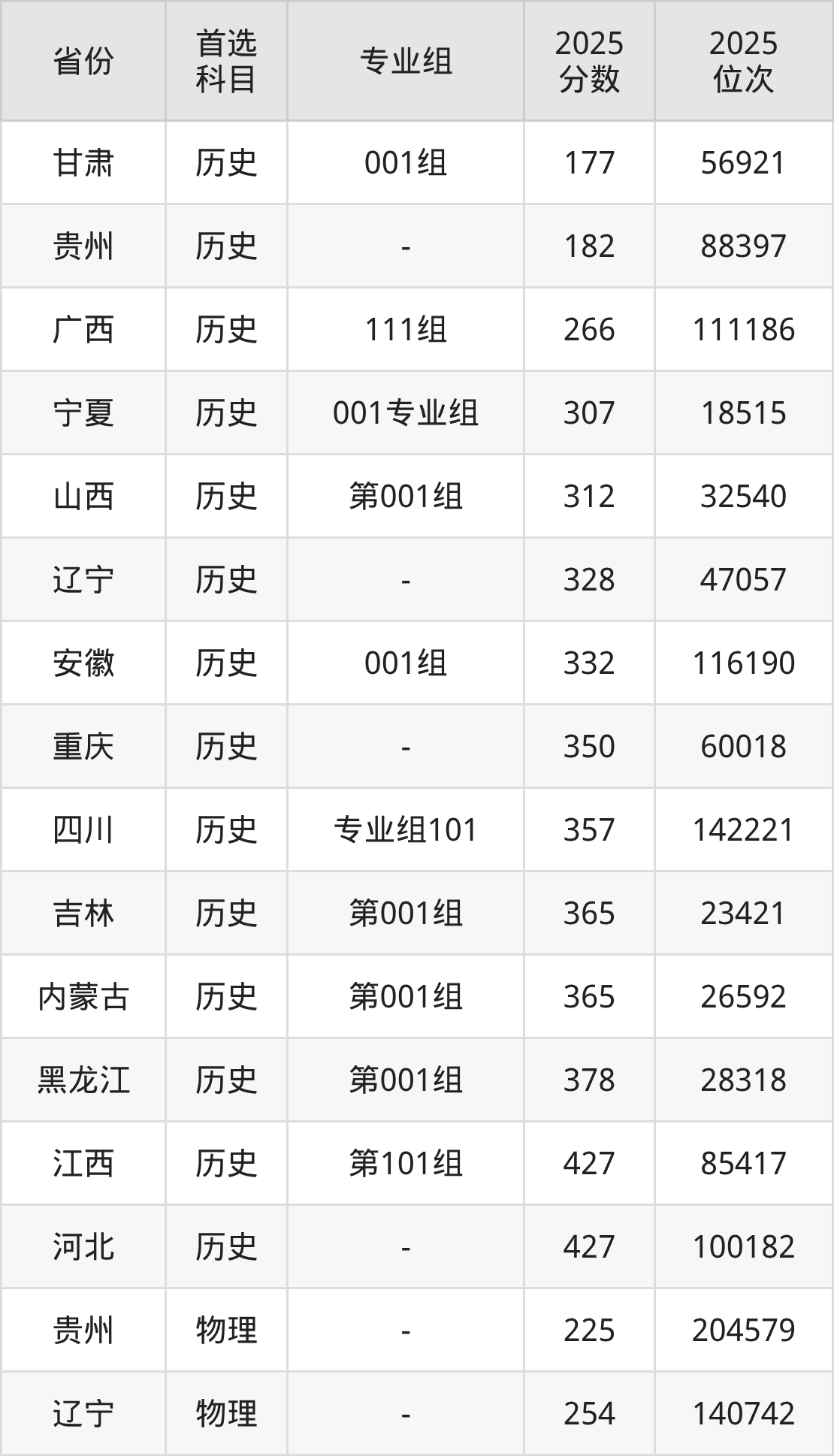 历史类最低分对应地区为甘肃(001组),录取位次为56921,超专科线17分;最高分对应地区为河北,录取位次为100182,超专科线227分。