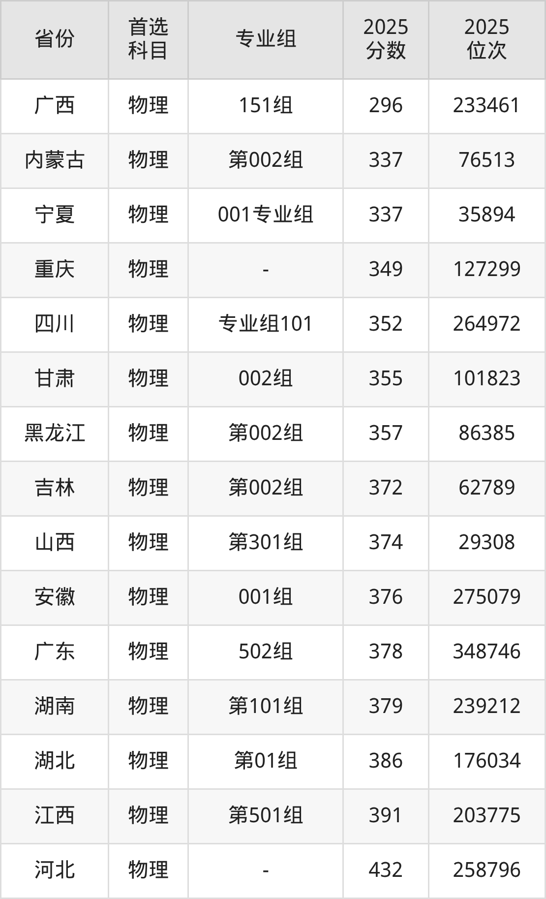 物理类:343分、125956名;
