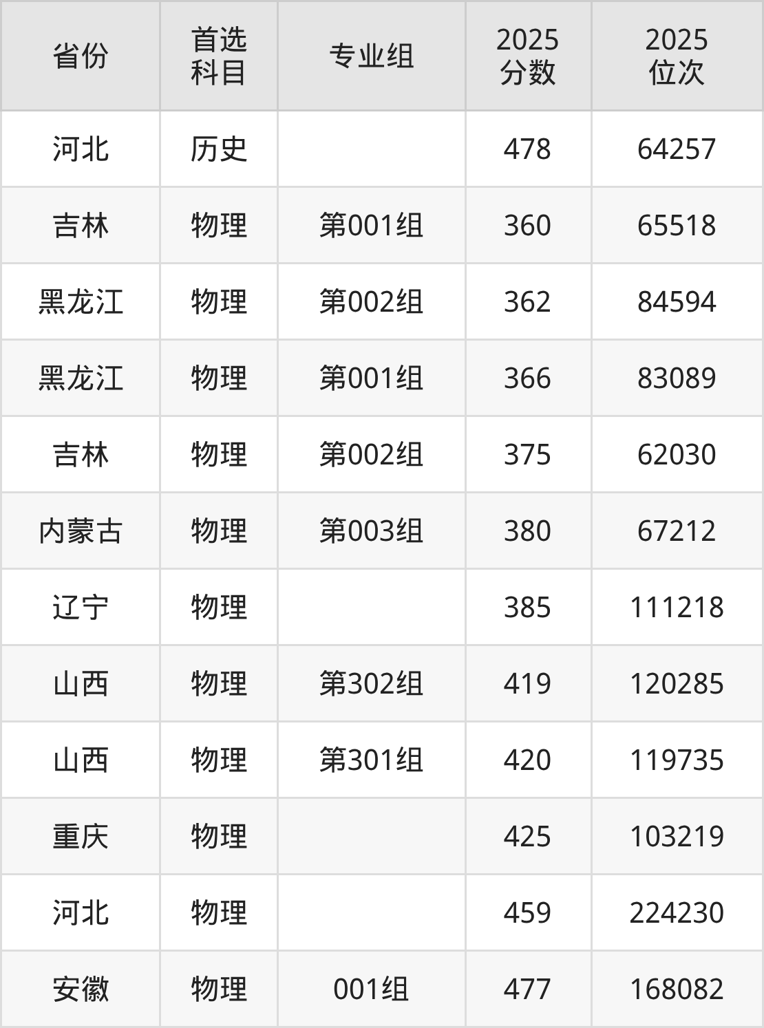 物理类最低分对应地区为吉林(第001组),录取位次为65518;最高分对应地区为安徽(001组),录取位次为168082,超本科线16分。