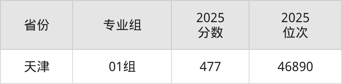 最低分对应地区为天津(01组),录取位次为46890,超本科线1分。