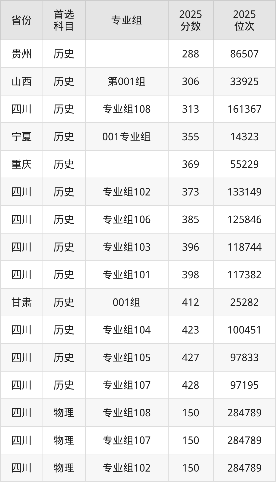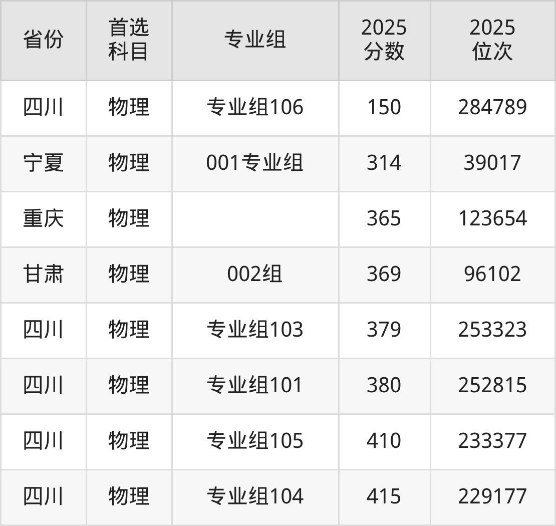 物理类最低分对应地区为四川(专业组108),录取位次为284789;最高分对应地区为四川(专业组104),录取位次为229177,超专科线265分。