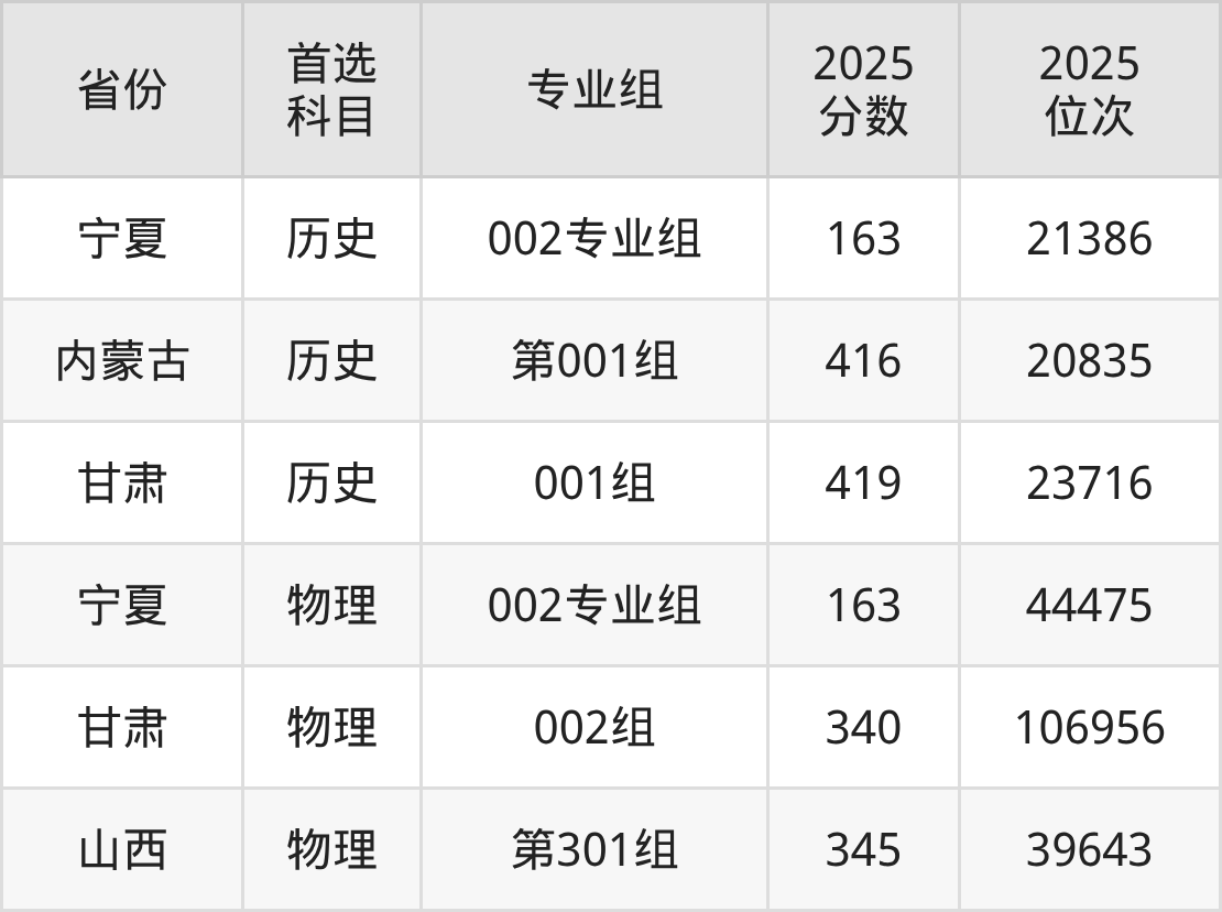 历史类最低分对应地区为宁夏(002专业组),录取位次为21386,超专科线13分;最高分对应地区为甘肃(001组),录取位次为23716,超专科线259分。