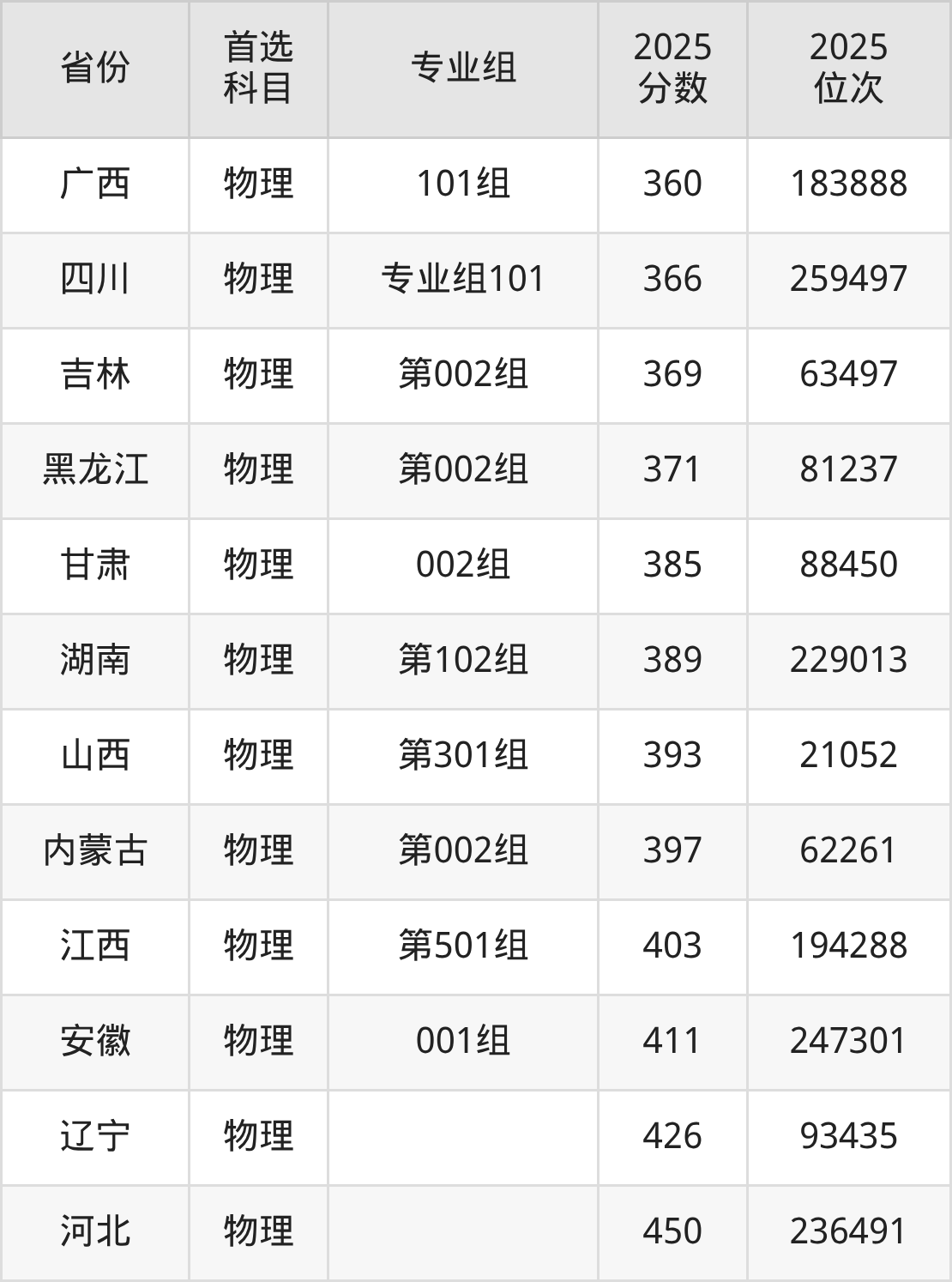 物理类最低分对应地区为贵州,录取位次为178678,超专科线175分;最高分对应地区为河北,录取位次为236491。
