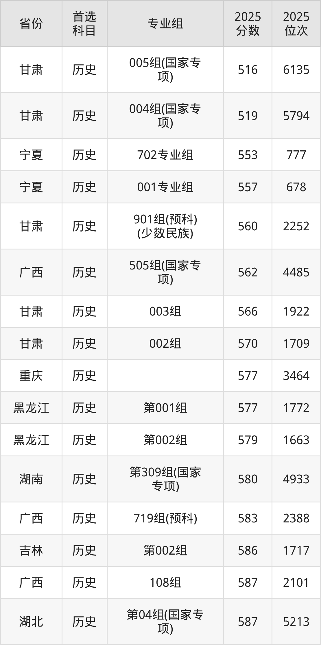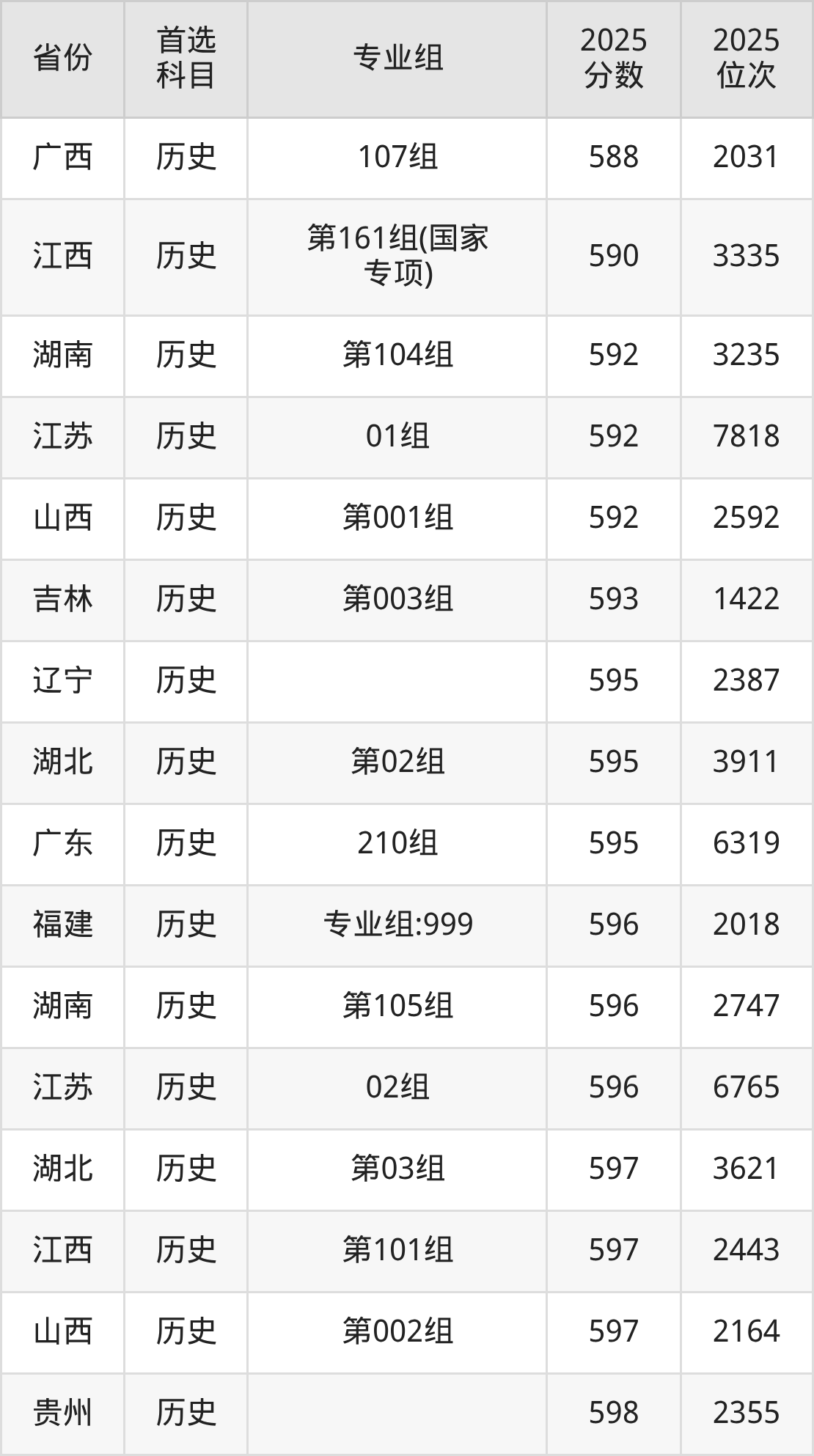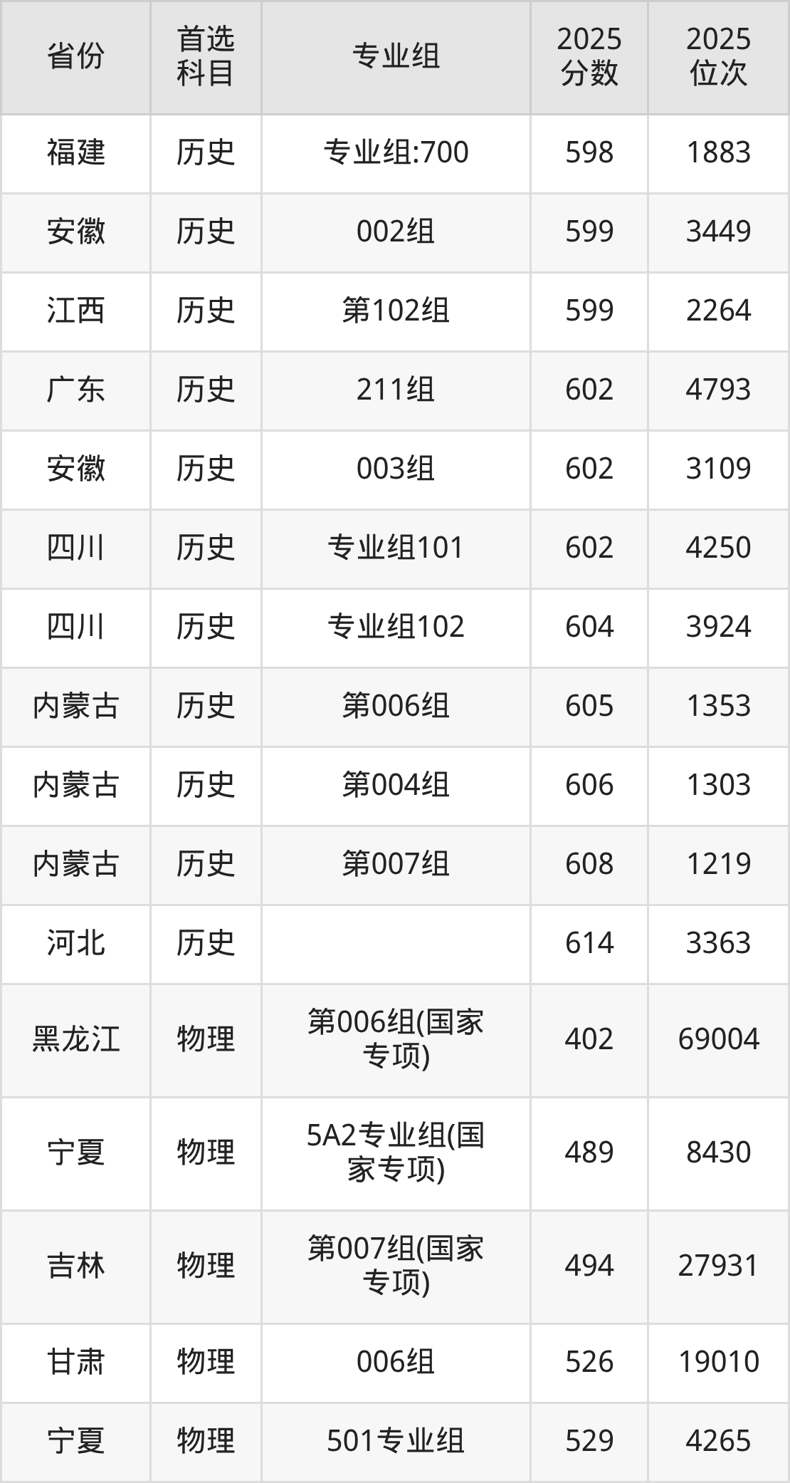 历史类最低分对应地区为甘肃(005组(国家专项)),录取位次为6135,超本科线104分;最高分对应地区为河北,录取位次为3363,超本科线137分。