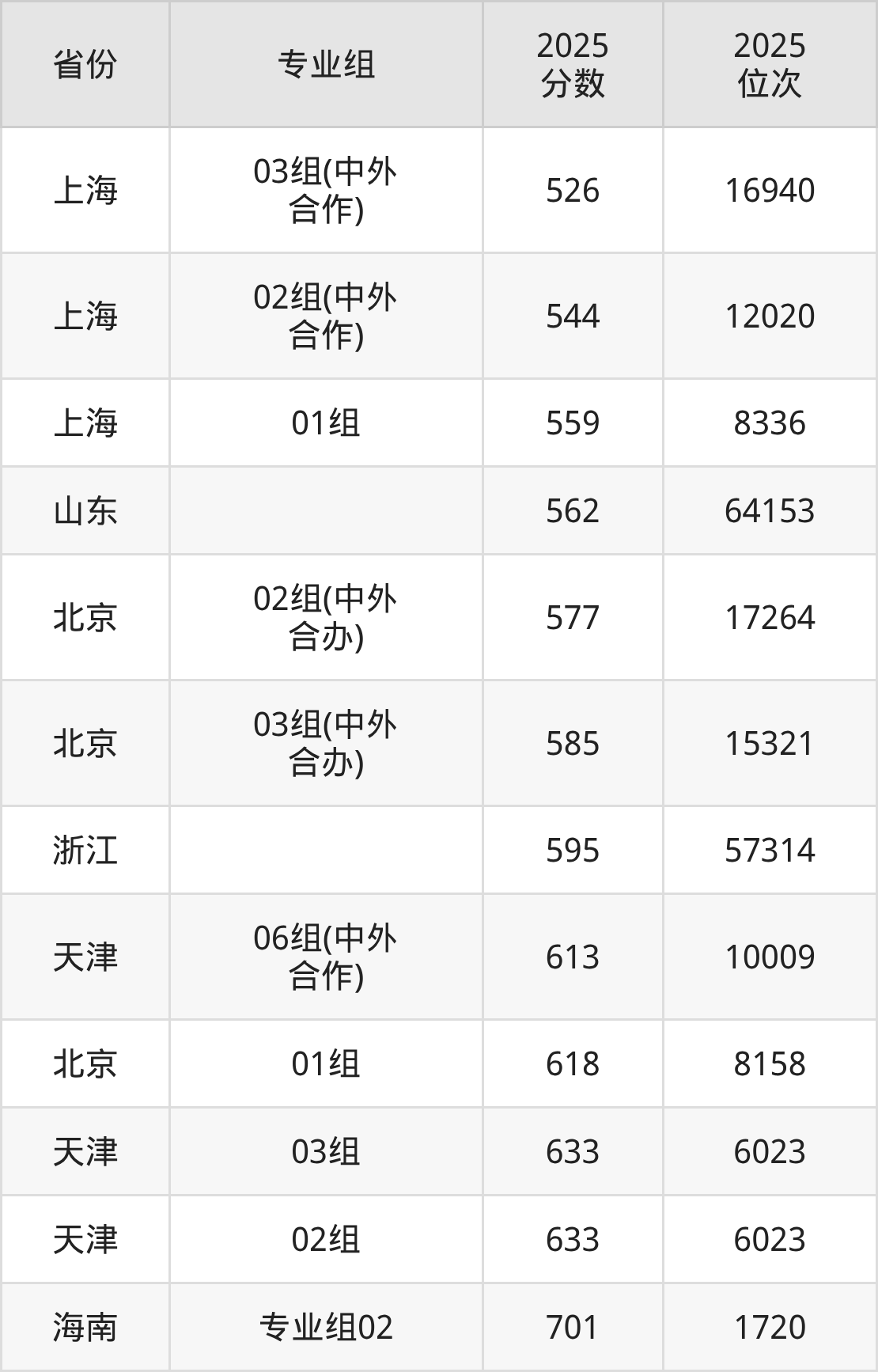 最低分对应地区为上海(03组(中外合作)),录取位次为16940,超本科线124分;最高分对应地区为海南(专业组02),录取位次为1720,超本科线221分。