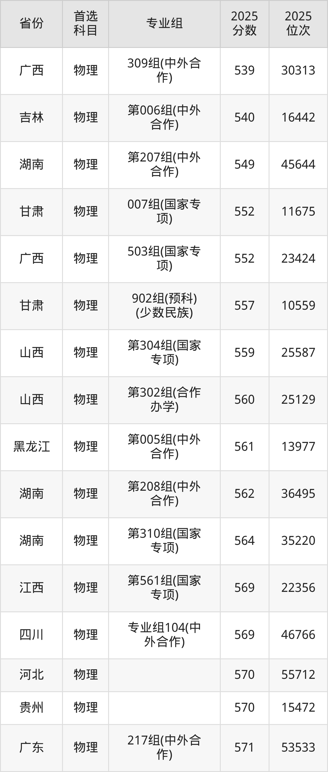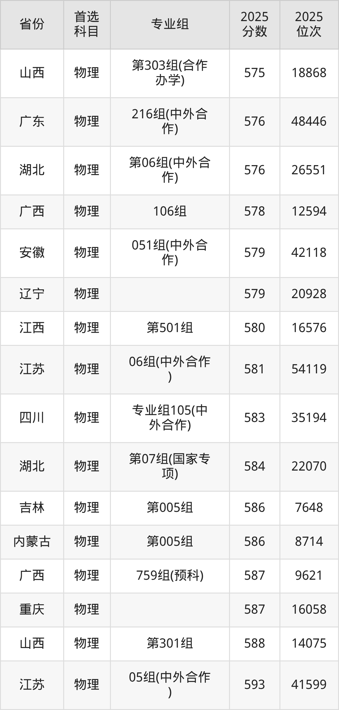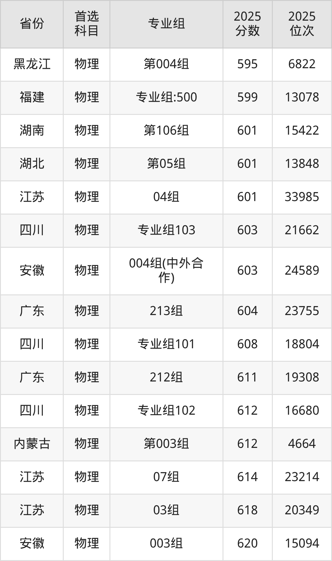 物理类:专业组101608分、18804名,专业组102612分、16680名,专业组103603分、21662名,专业组104(中外合作)569分、46766名,专业组105(中外合作)583分、35194名;