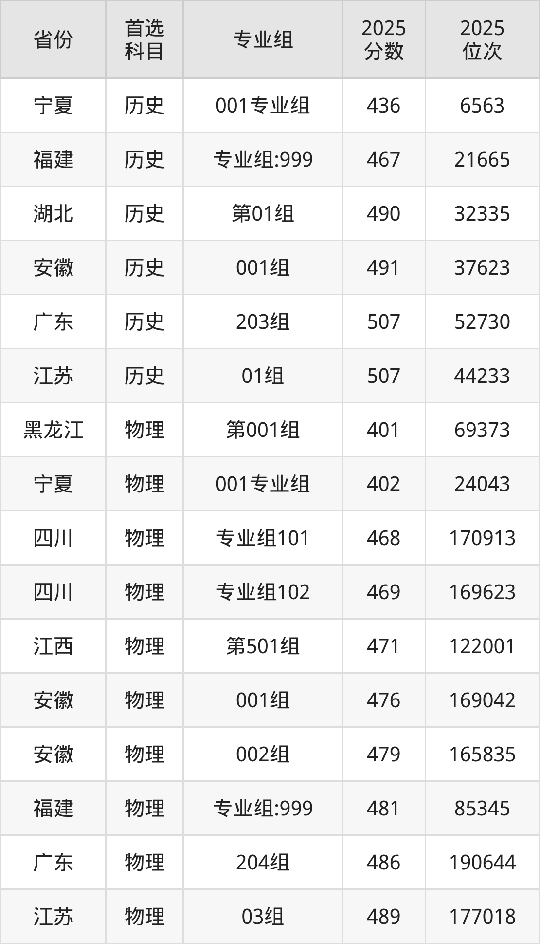 历史类最低分对应地区为宁夏(001专业组),录取位次为6563,超本科B32分;最高分对应地区为江苏(01组),录取位次为44233,超本科线25分。