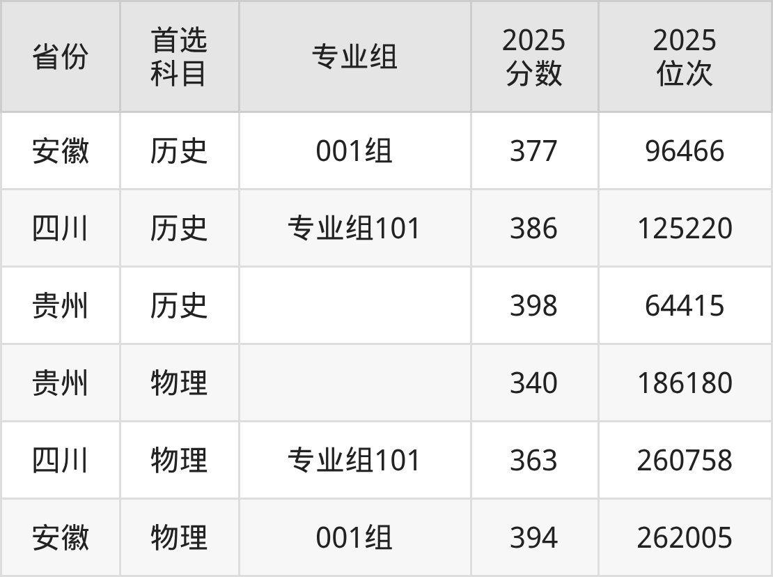 历史类最低分对应地区为安徽(001组),录取位次为96466,超专科线177分;最高分对应地区为贵州,录取位次为64415,超专科线218分。