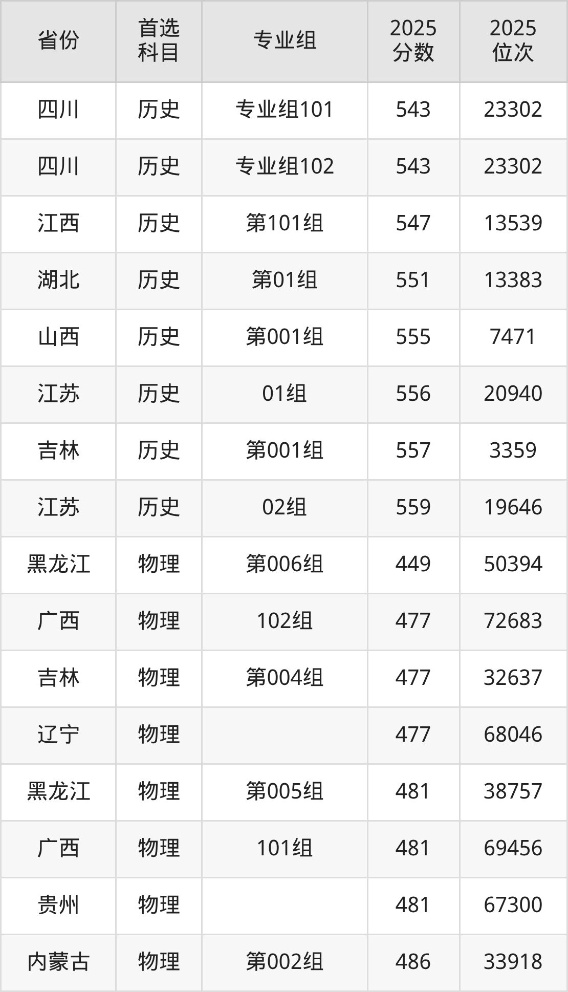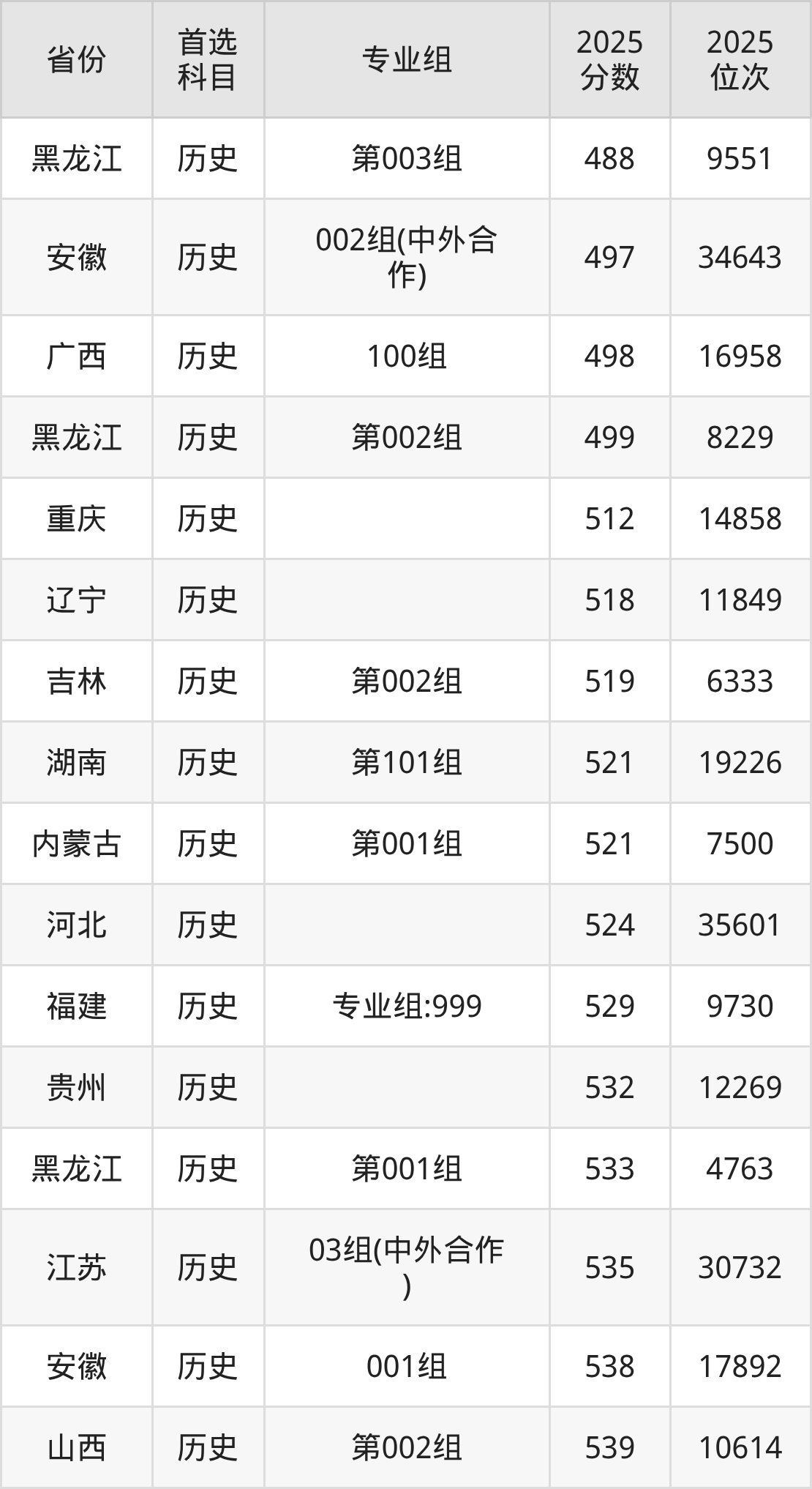历史类最低分对应地区为黑龙江(第003组),录取位次为9551,超本科线83分;最高分对应地区为江苏(02组),录取位次为19646,超本科线77分。