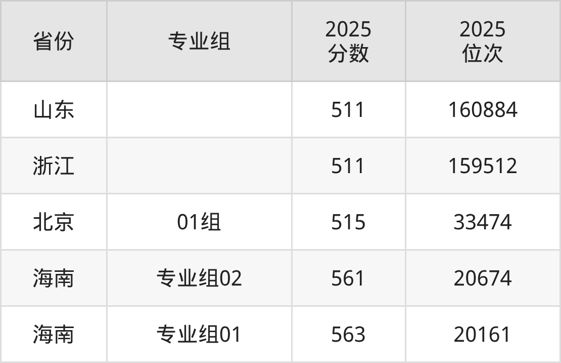 最低分对应地区为山东,录取位次为160884;最高分对应地区为海南(专业组01),录取位次为20161,超本科线83分。