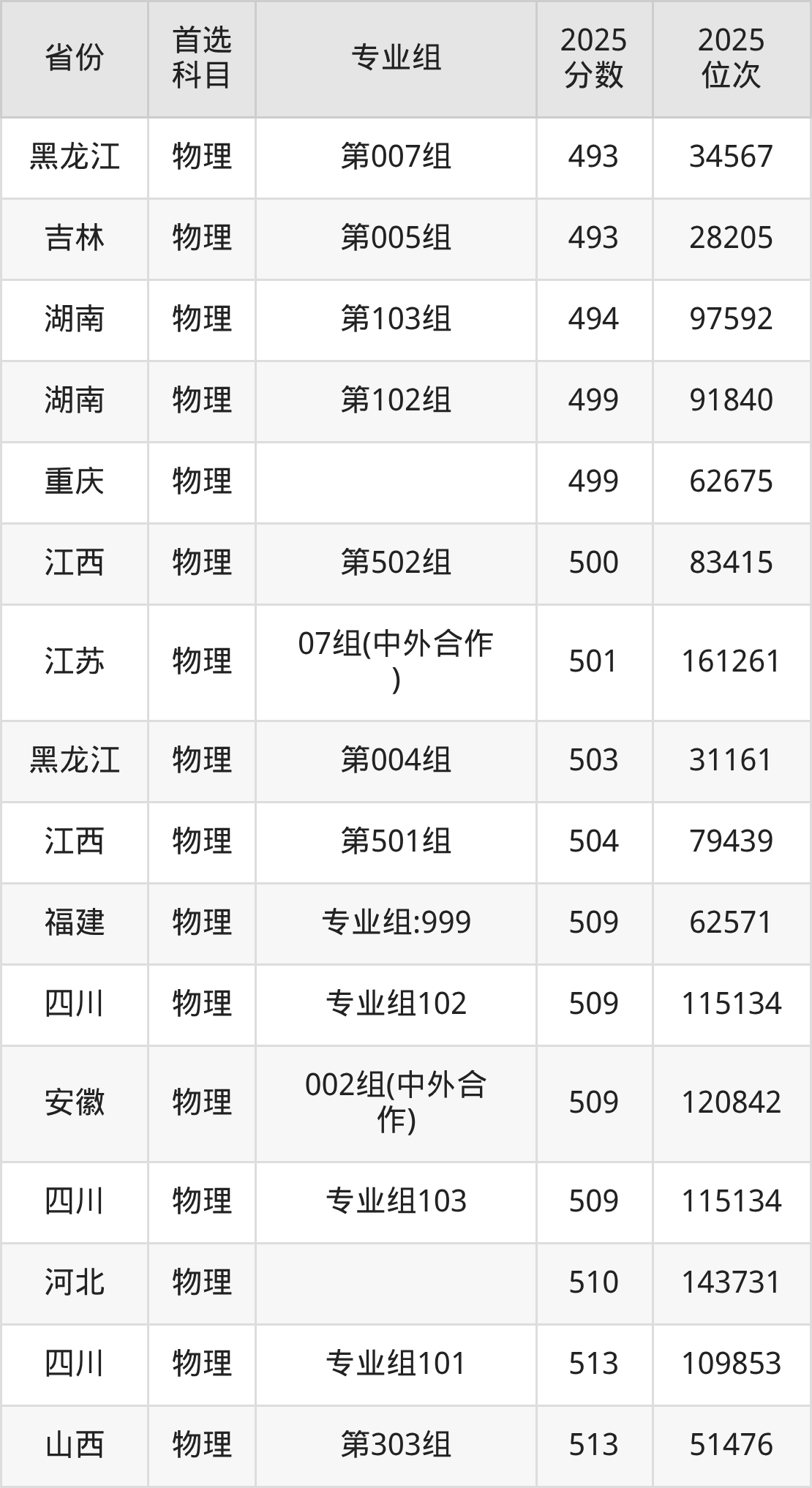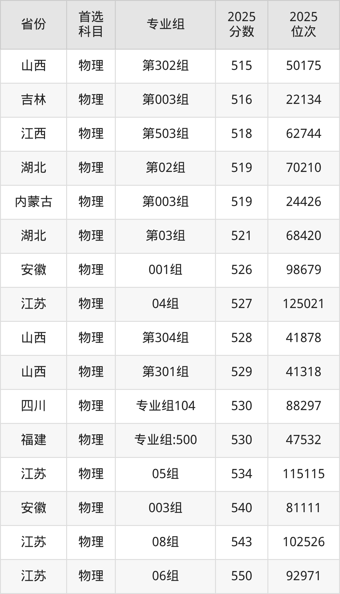 物理类最低分对应地区为黑龙江(第006组),录取位次为50394,超本科线89分;最高分对应地区为江苏(06组),录取位次为92971,超本科线87分。