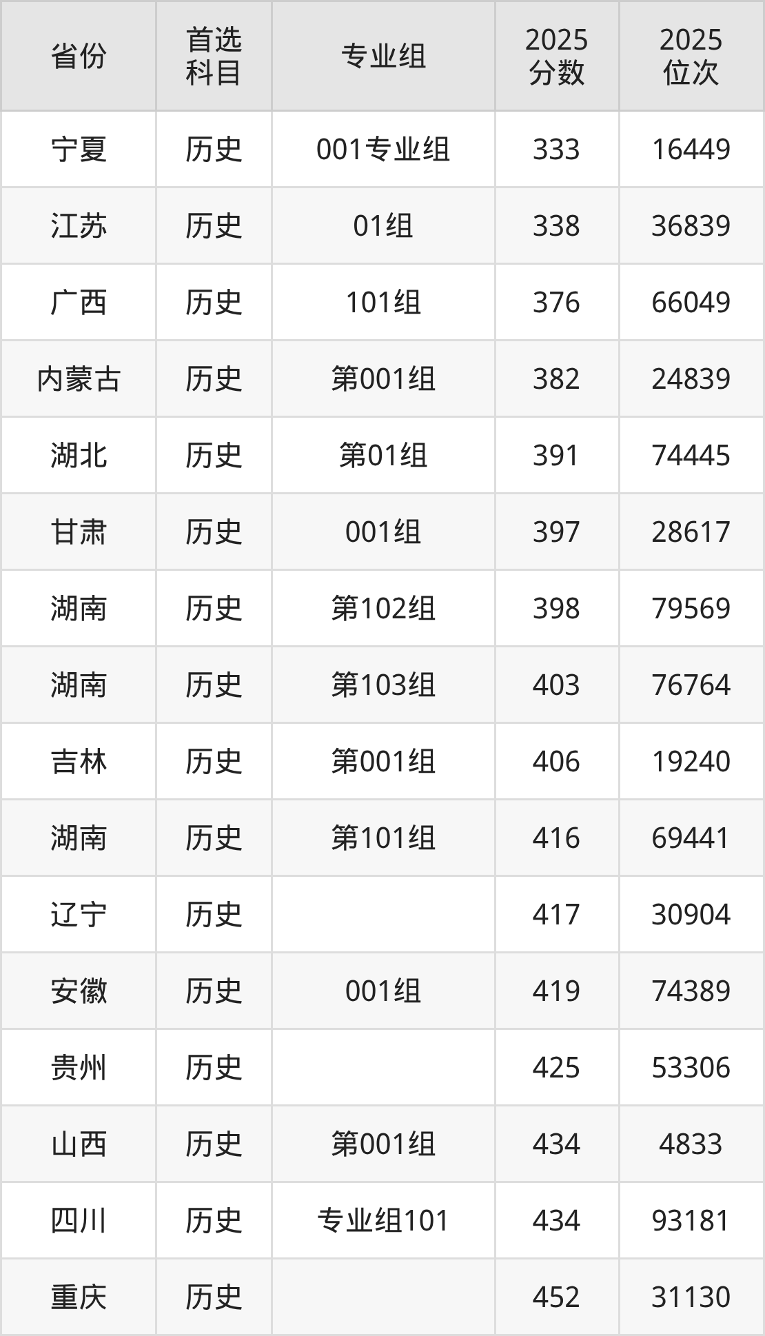 历史类最低分对应地区为宁夏(001专业组),录取位次为16449,超专科线183分;最高分对应地区为江西(第101组),录取位次为51758,超专科线189分。