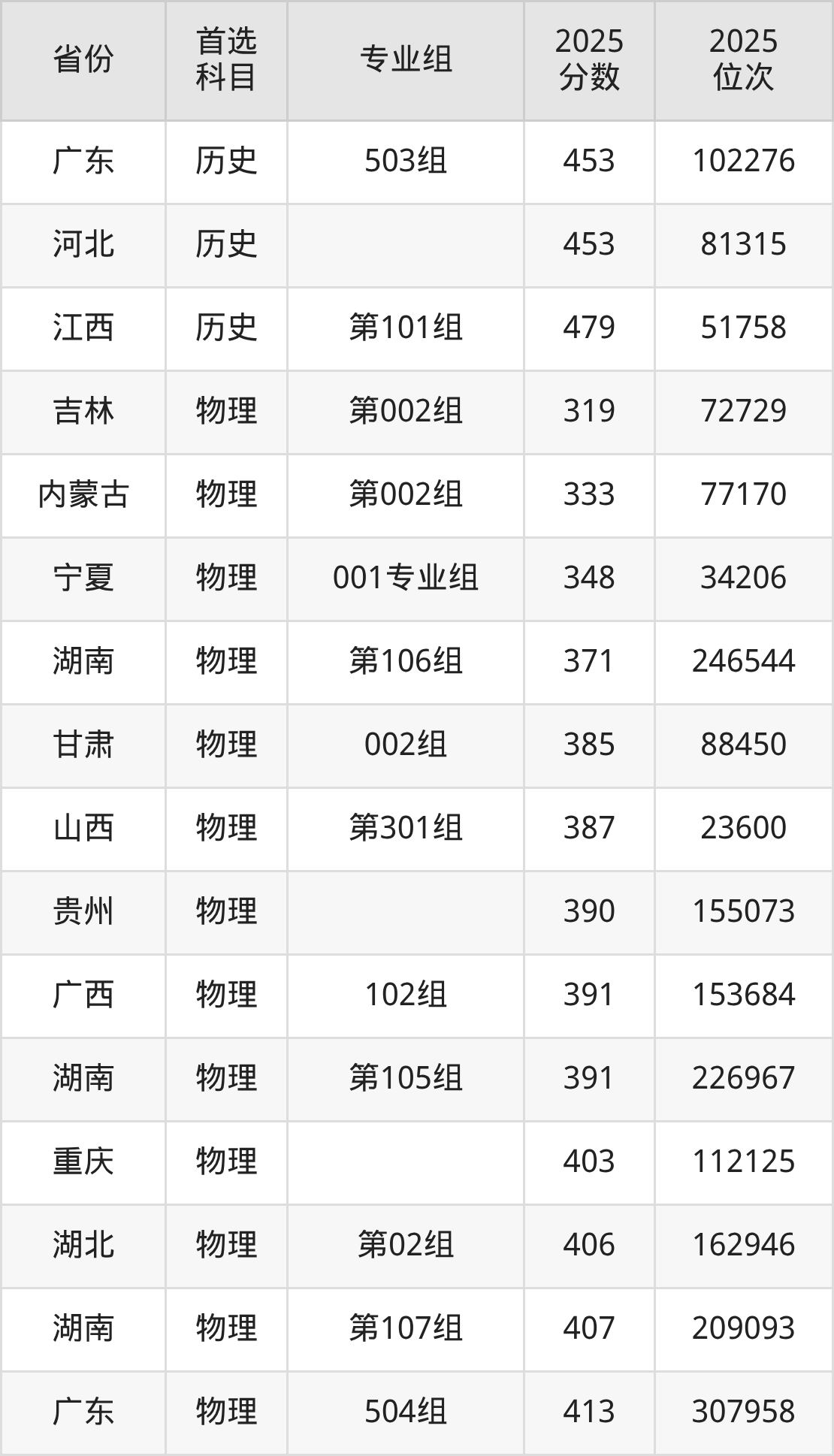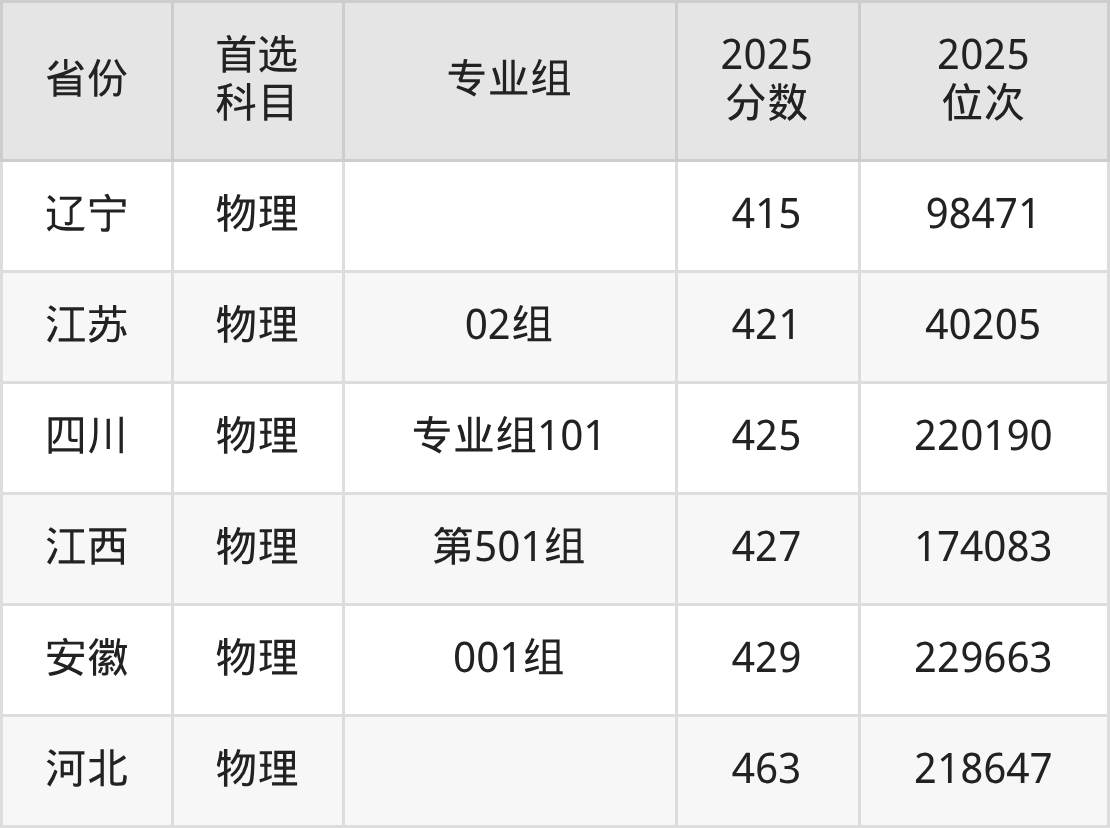 物理类最低分对应地区为吉林(第002组),录取位次为72729,超专科线159分;最高分对应地区为河北,录取位次为218647,超专科线263分。