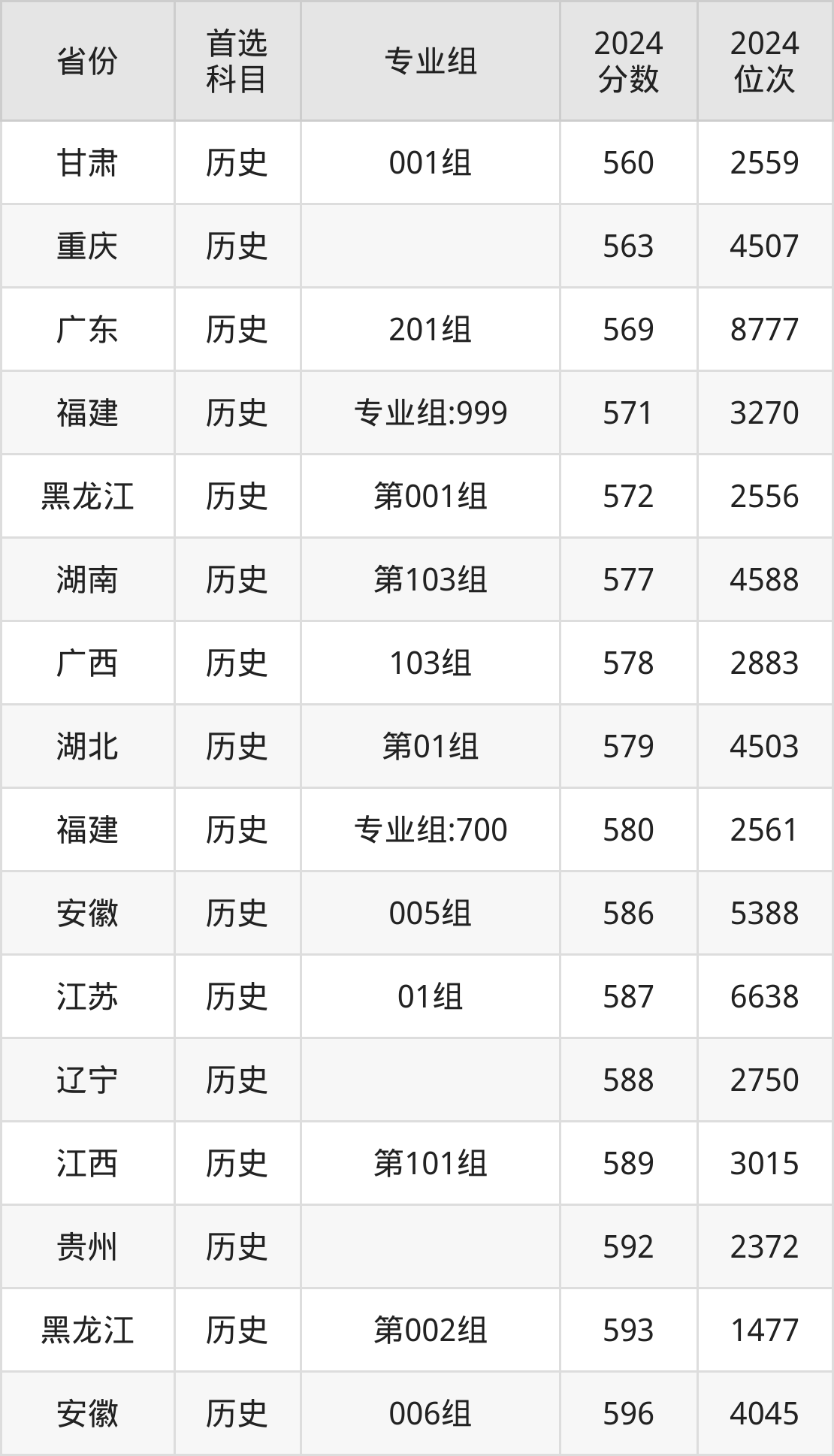 历史类最低分对应地区为甘肃(001组),录取位次为2559,超本科线139分;最高分对应地区为河北,录取位次为3619,超本科线156分。
