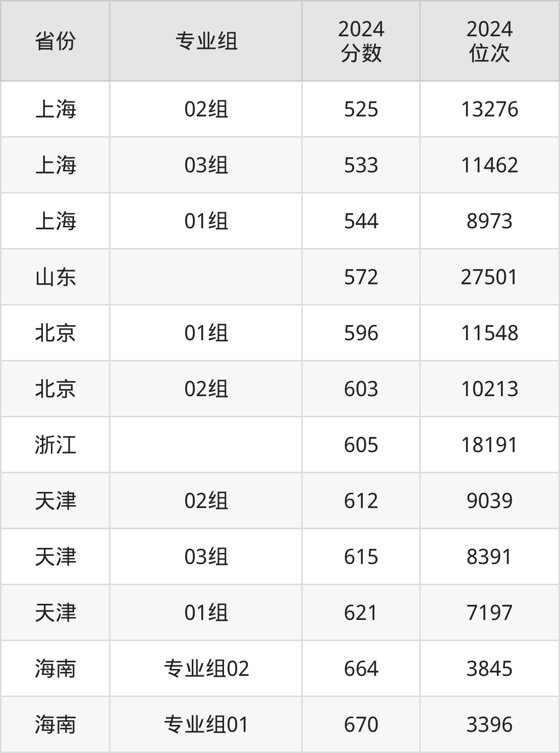 最低分对应地区为上海(02组),录取位次为13276,超本科线122分;最高分对应地区为海南(专业组01),录取位次为3396,超本科线187分。