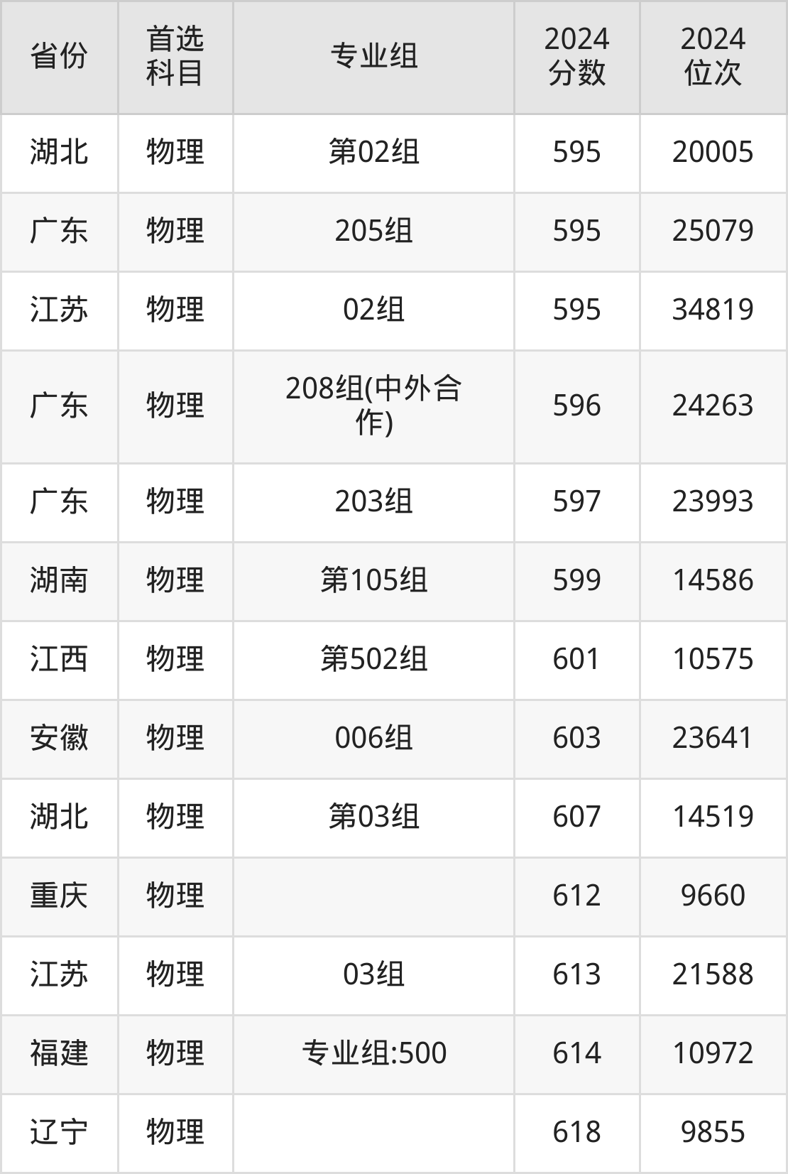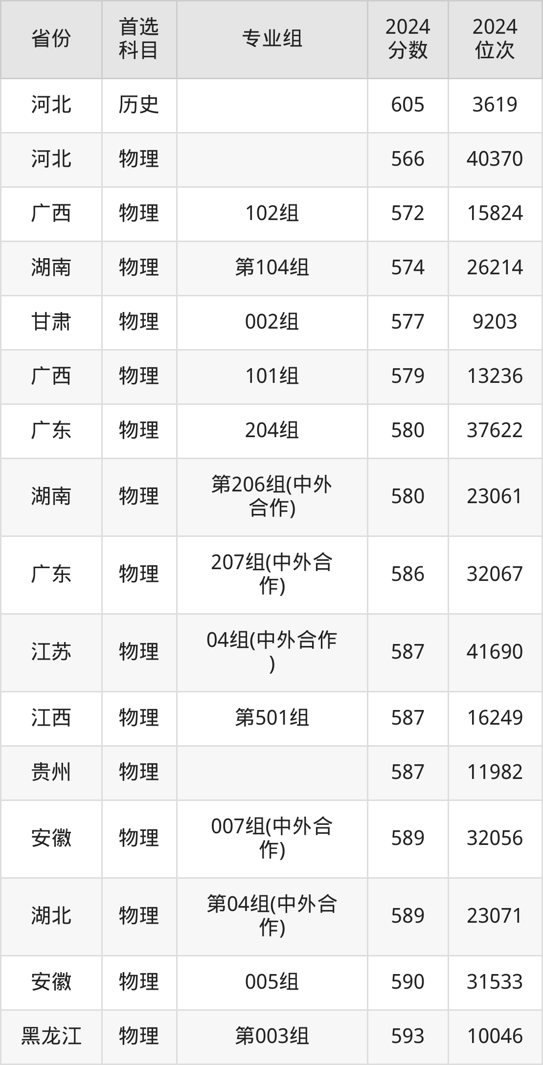 物理类:005组590分、31533名,006组603分、23641名,007组(中外合作)589分、32056名;