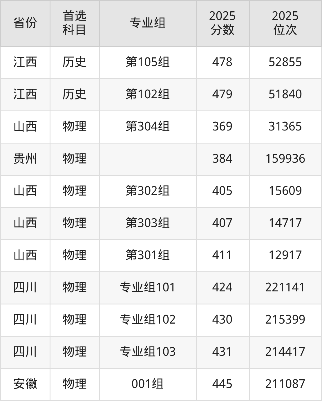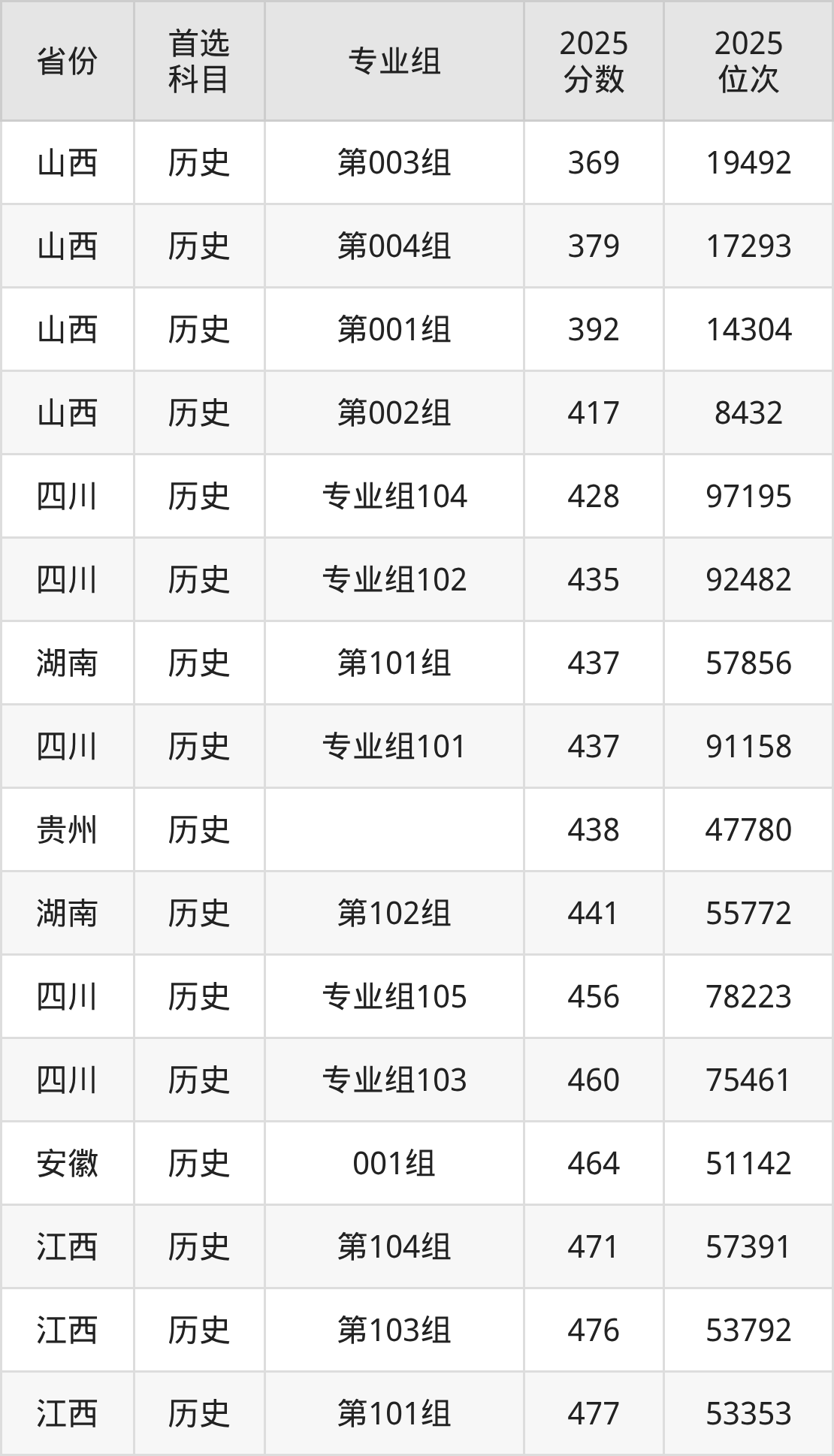 历史类最低分对应地区为山西(第003组),录取位次为19492,超专科线269分;最高分对应地区为江西(第102组),录取位次为51840,超专科线189分。