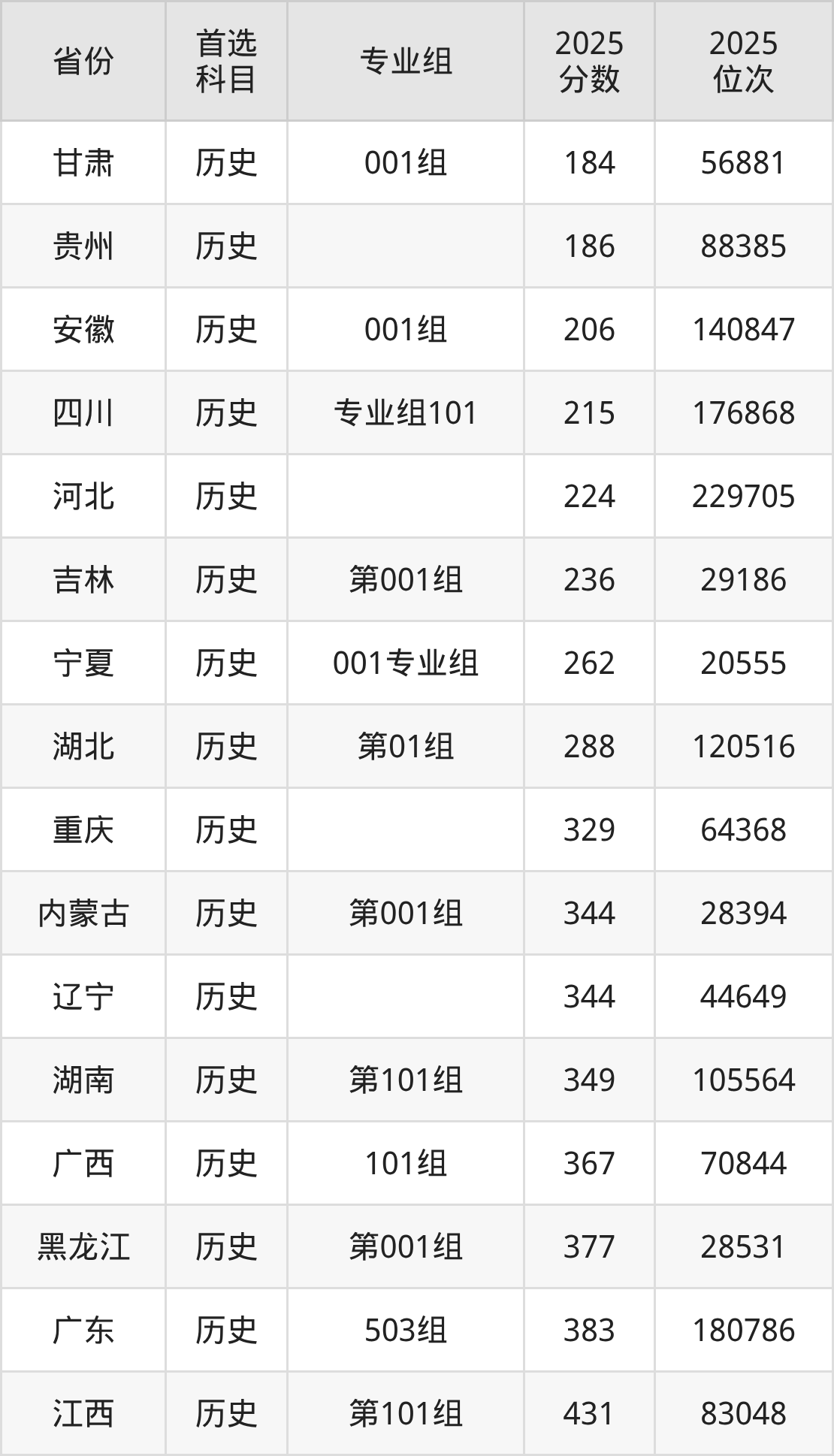 历史类最低分对应地区为甘肃(001组),录取位次为56881,超专科线24分;最高分对应地区为江西(第101组),录取位次为83048,超专科线141分。