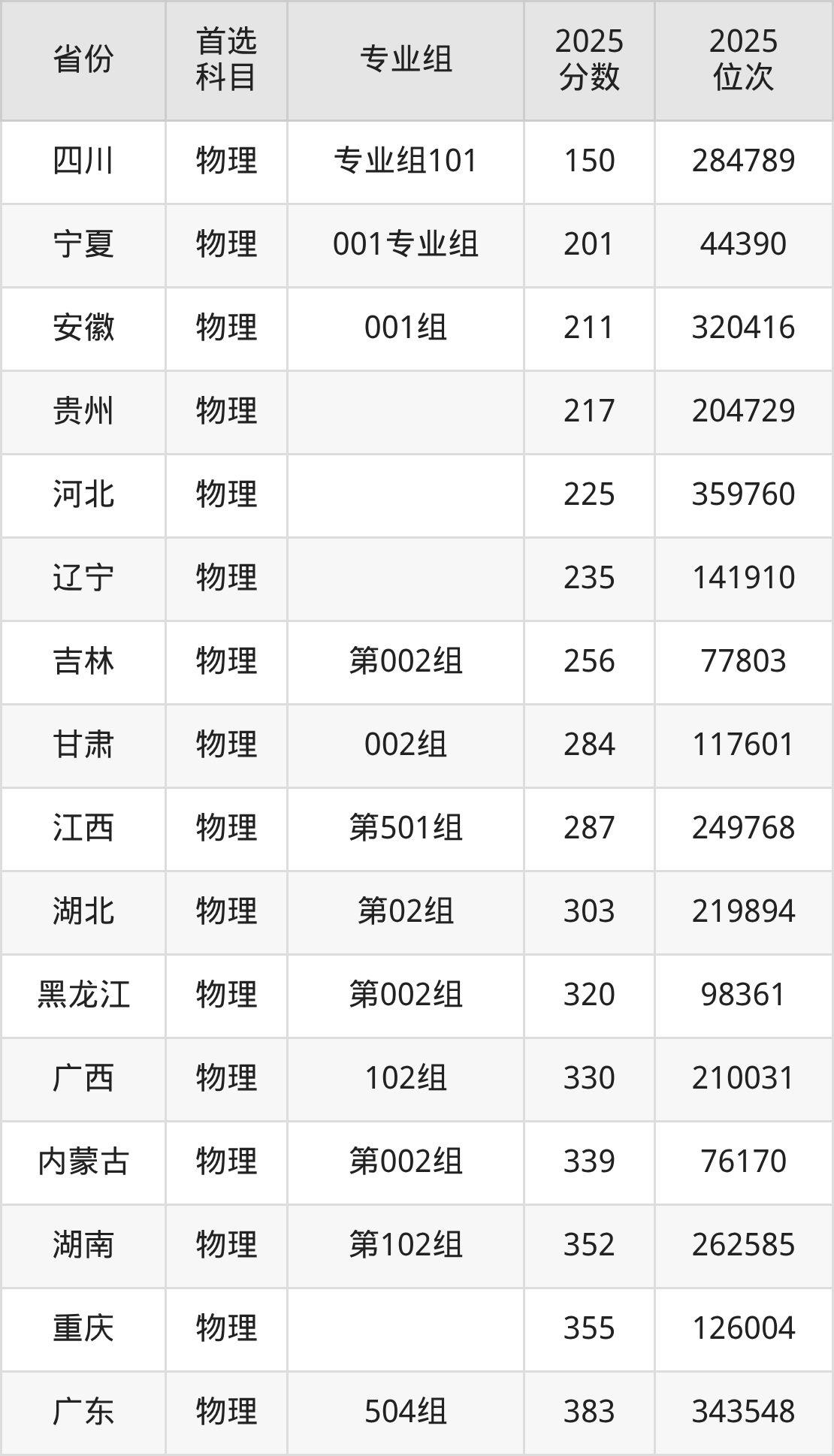 物理类最低分对应地区为四川(专业组101),录取位次为284789;最高分对应地区为广东(504组),录取位次为343548,超专科线183分。