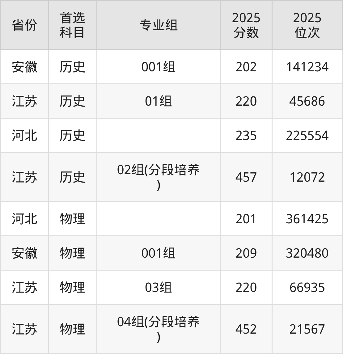 历史类:01组220分、42602名,02组(分段培养)382分、23064名;