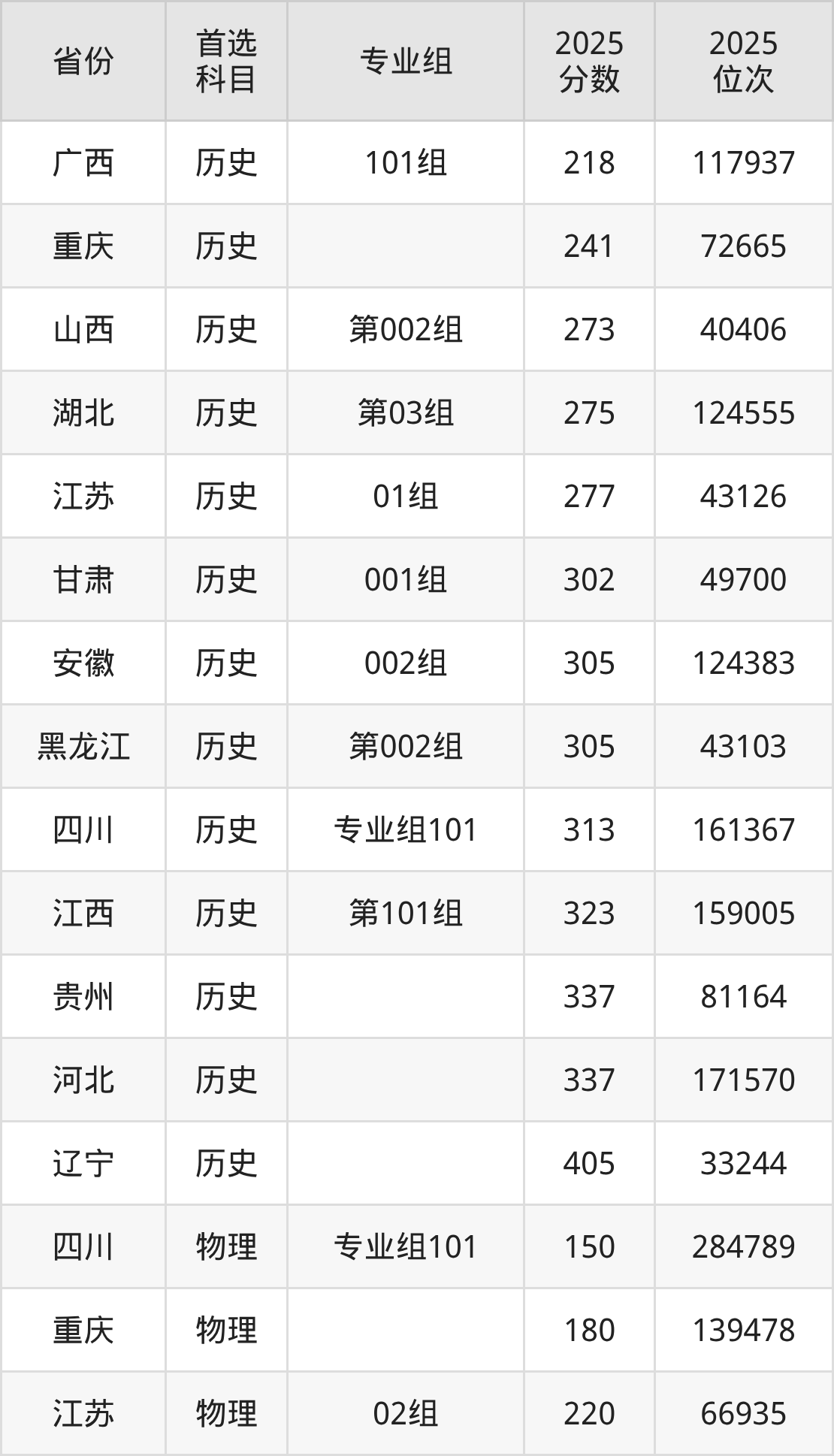 历史类最低分对应地区为广西(101组),录取位次为117937,超专科线18分;最高分对应地区为辽宁,录取位次为33244,超专科线255分。